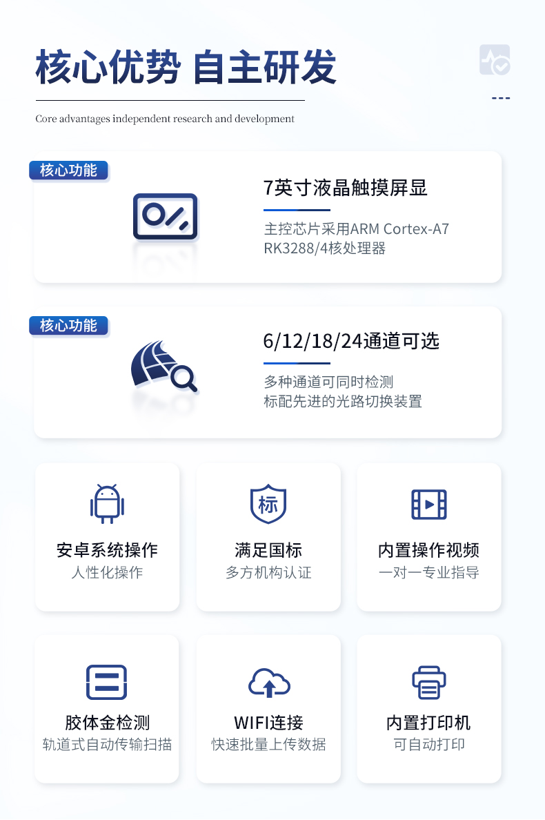 | 1、主控芯片采用ARM Cortex-A7,RK3288/4核處理器,主頻1.88Ghz,運(yùn)轉(zhuǎn)速度更快速,穩(wěn)定性更強(qiáng)。 | 2、顯示方式:7英寸液晶觸摸屏顯示,人性化中文操作界面,讀數(shù)直觀、簡(jiǎn)單。 | 3、交直流兩用,直流12V供電,可連接車(chē)載電源,可配6ah大容量充電鋰電池,方便戶外流動(dòng)測(cè)試。 | 4、四波長(zhǎng)冷光源,12個(gè)檢測(cè)通道,每個(gè)通道均配置410、520、590、630nm波長(zhǎng)光源,標(biāo)配**的光路切換裝置,專(zhuān)業(yè)光路切換功能可實(shí)現(xiàn)*多64波長(zhǎng),并且所有檢測(cè)項(xiàng)目可實(shí)現(xiàn)所有通道同時(shí)檢測(cè)。 | 5、智能恒流穩(wěn)壓,光強(qiáng)自動(dòng)調(diào)節(jié)與校準(zhǔn),長(zhǎng)時(shí)間連續(xù)工作光源無(wú)溫漂現(xiàn)象。 | ★6、內(nèi)置新國(guó)家限量標(biāo)準(zhǔn),與所測(cè)結(jié)果進(jìn)行現(xiàn)場(chǎng)比對(duì),并持續(xù)更新標(biāo)準(zhǔn)。 | 7、不間斷進(jìn)樣,連續(xù)檢測(cè) | 8、樣本編號(hào)自動(dòng)累加。 | 9、數(shù)據(jù)無(wú)線上傳平臺(tái),并可從平臺(tái)導(dǎo)出為Excel表格。 | 10、檢測(cè)結(jié)果存儲(chǔ)容量20萬(wàn)條。 | ★11、同時(shí)支持U盤(pán)拷貝,標(biāo)準(zhǔn)USB接口,免驅(qū)動(dòng)插拔。 | 12、檢測(cè)項(xiàng)目可擴(kuò)充,固件可升級(jí) | 13、儀器尺寸:430*343*188mm, 主機(jī)凈重:5.1kg | 14、儀器包裝尺寸:510*390*375mm 包裝重量:8.5kg |