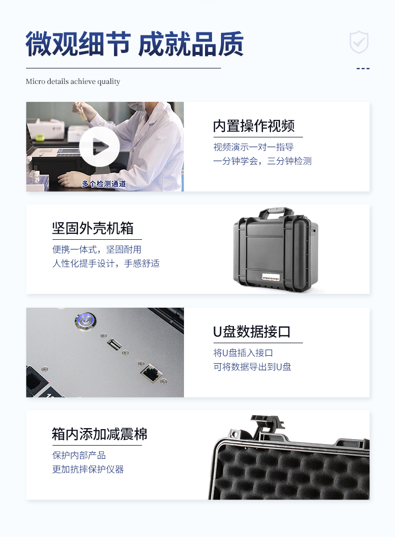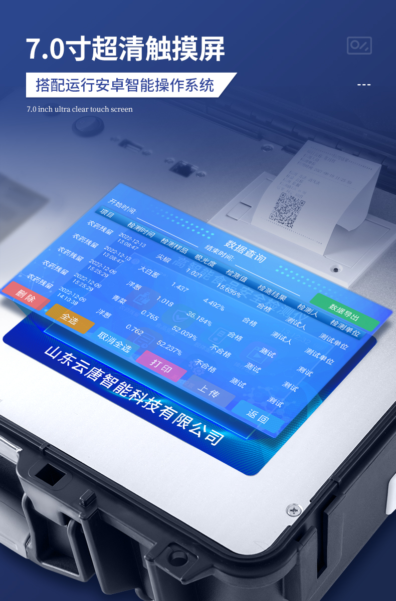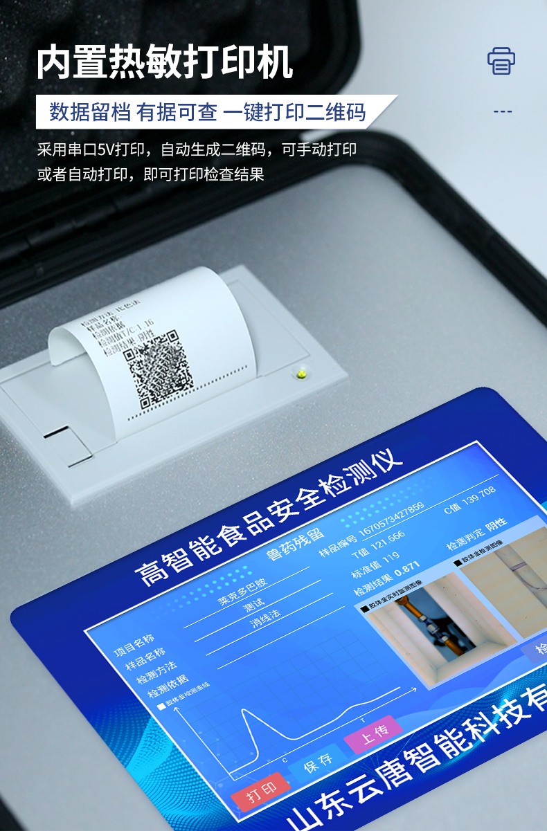 | 安卓智能操作系統(tǒng),采用更加**的UI交互界面,儀器具有wifi聯(lián)網(wǎng)上傳、4G聯(lián)網(wǎng)傳輸、GPRS無(wú)線遠(yuǎn)傳、網(wǎng)線連接功能,快速批量上傳數(shù)據(jù)。 | 智能化程度高,儀器具有自檢功能:具有開(kāi)機(jī)自檢和調(diào)零功能,具有自動(dòng)檢測(cè)重復(fù)性功能。 | 新一代高速熱敏打印機(jī),檢測(cè)完成可自動(dòng)打印或批量打印檢測(cè)報(bào)告和二維碼。 | 儀器帶有監(jiān)管平臺(tái),數(shù)據(jù)可局域網(wǎng)和互聯(lián)網(wǎng)數(shù)據(jù)上傳,檢測(cè)結(jié)果直接傳至食品安全監(jiān)管平臺(tái)。進(jìn)行區(qū)域食品安全監(jiān)管及大數(shù)據(jù)分析處理與數(shù)據(jù)統(tǒng)計(jì),檢測(cè)區(qū)域食品安全長(zhǎng)短期動(dòng)態(tài),達(dá)到食品安全問(wèn)題預(yù)估、預(yù)警 | 一體化主機(jī),包含食品安全檢測(cè)模塊、多通道農(nóng)藥殘留檢測(cè)模塊、膠體金免疫層析檢測(cè)模塊。 | 一體化便攜式快檢設(shè)備,滿足現(xiàn)場(chǎng)及流動(dòng)檢測(cè)使用需求,能夠在同一軟件下實(shí)現(xiàn)所有檢測(cè)項(xiàng)目的檢測(cè),并可通過(guò)同一窗口直觀顯示檢測(cè)結(jié)果。 | 膠體金模塊檢測(cè)方式:軌道式自動(dòng)傳輸掃描,檢測(cè)完成后自動(dòng)退出檢測(cè)卡。 | 食品安全檢測(cè)儀CT線自動(dòng)識(shí)別,無(wú)需手動(dòng)調(diào)整,檢測(cè)完成自動(dòng)顯示CT坐標(biāo)曲線。 | 內(nèi)置強(qiáng)大的數(shù)據(jù)庫(kù),具有多品類(lèi)多種類(lèi)樣品菜單功能,可靈活選擇檢測(cè)樣品,不同的檢測(cè)通道可同時(shí)檢測(cè)不同的樣品項(xiàng)目。也可在儀器上直接編輯錄入樣品名稱、檢測(cè)指標(biāo)、送檢單位等信息并保存進(jìn)樣品數(shù)據(jù)庫(kù)。 | 產(chǎn)品內(nèi)置操作演示視頻,是您身邊的化驗(yàn)指導(dǎo)專(zhuān)家。 | 樣品處理簡(jiǎn)單省力,整體操作快速、安全、便捷。 | 儀器具有自身保護(hù)功能,可設(shè)置用戶名及密碼,防止非工作人員操作等。 | 高靈敏度,高檢測(cè)精度,高重復(fù)性精度,掃描式高精度光學(xué)傳感器。 | 結(jié)果判定線可修改,對(duì)照值標(biāo)定值可保存,斷電不丟失數(shù)據(jù)。 | 兼容市場(chǎng)上所有的膠體金卡,使用耗材不受限制,極大增強(qiáng)用戶使用體驗(yàn)。 | 儀器具有重新校準(zhǔn)、鎖定、恢復(fù)出廠設(shè)置功能。 |