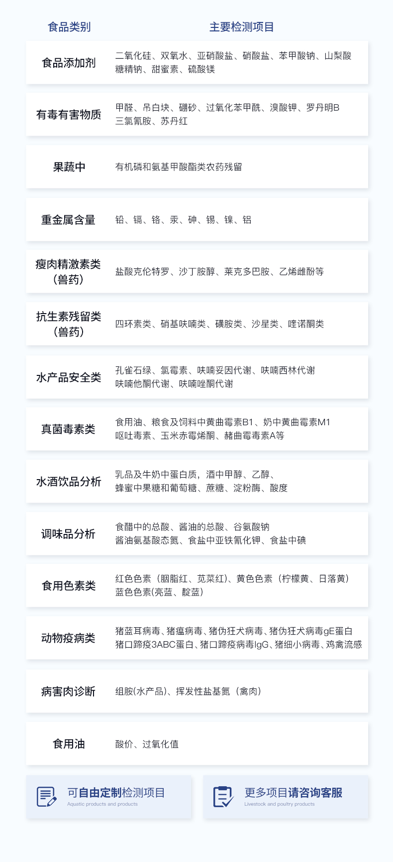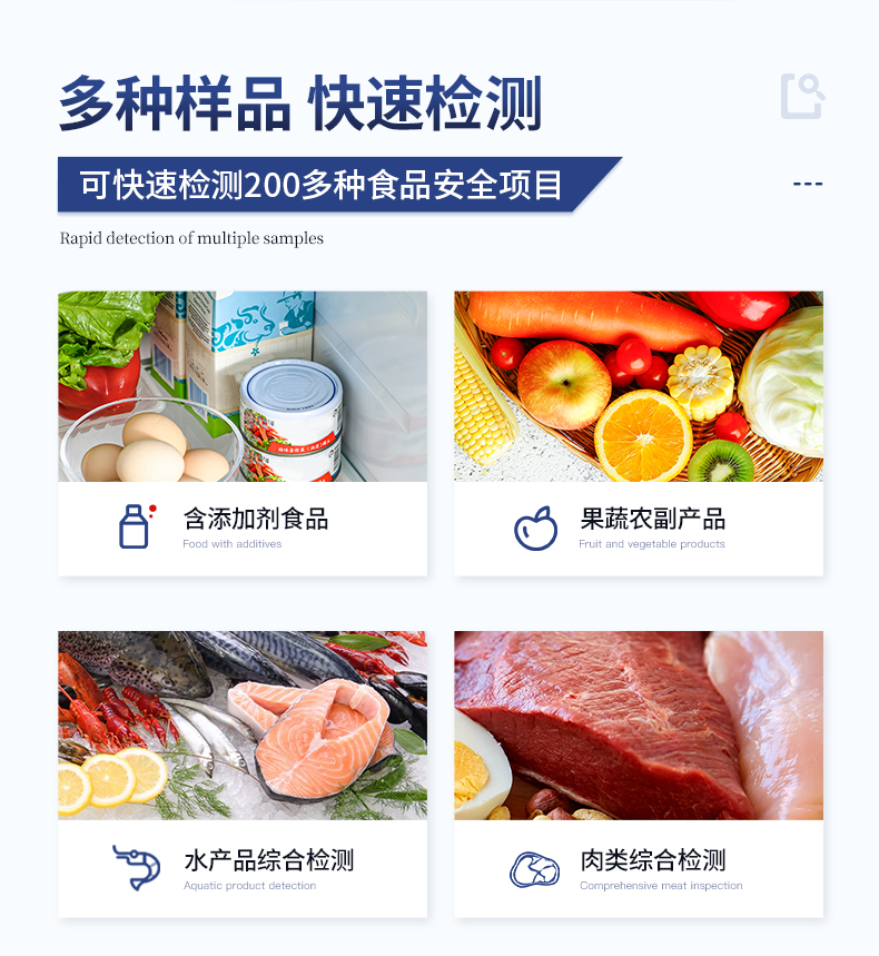 | 食品添加劑:二氧化硫、雙氧水、亞硝酸鹽、硝酸鹽、苯甲酸鈉、山梨酸、糖精鈉、甜蜜素、安賽蜜、硫酸鎂等 | 有毒有害物質(zhì):甲醛、吊白塊、硼砂、過(guò)氧化苯甲酰、溴酸鉀、羅丹明B、三聚氰胺、蘇丹紅等 | 農(nóng)藥殘留:酶抑制率法:有機(jī)磷氨基甲酸酯類(lèi)農(nóng)藥;膠體金法:各種具體農(nóng)藥檢測(cè) | 病害肉診斷:組胺、揮發(fā)性鹽基氮、肉制品酸價(jià)、水發(fā)產(chǎn)品中組胺 | 重金屬含量:鉛、鎘、鉻、汞、砷、錫、鎳、鋁等;食用油脂檢測(cè):過(guò)氧化值、酸價(jià)、油脂丙二醛等。 | 食用油脂檢測(cè):::過(guò)氧化值、酸價(jià)、油脂丙二醛、總多酚等。 | 瘦肉精激素類(lèi)(獸藥):鹽酸克倫特羅、沙丁胺醇、萊克多巴胺、己烯雌酚、喹乙醇等 | 抗生素殘留類(lèi)(獸藥):四環(huán)素類(lèi)、硝基呋喃類(lèi)、磺胺類(lèi)、β-興奮劑類(lèi)、沙星類(lèi)、磺胺類(lèi)、喹諾酮類(lèi),甲砜霉素,氟苯尼考,金剛烷胺、替米考星、慶大霉素、林可霉素、鏈霉素、恩諾沙星、環(huán)丙沙星、頭孢啦啶、青霉素、阿莫西林等 | 真菌毒素類(lèi):食用油、糧食及飼料中黃曲霉毒素B1、奶中黃曲霉毒素M1、嘔吐毒素、玉米赤霉烯酮、赭曲霉毒素A等 | 水酒飲品分析:乳品及牛奶中蛋白質(zhì);酒中甲醇、乙醇、雜醇油;蜂蜜中果糖和葡萄糖、蔗糖、淀粉酶、酸度;水中氰化物、余氯,飲料中維C等 | 調(diào)味品成分:食醋的總酸、醬油的總酸、芝麻油純度、谷氨酸鈉、醬油氨基酸態(tài)氮、食鹽中亞鐵氰化鉀、食鹽中碘等 | 食用色素類(lèi):紅色色素(胭脂紅、莧菜紅、赤蘚紅、誘惑紅)、黃色色素(檸檬黃、日落黃)、藍(lán)色色素(亮藍(lán))等 | 動(dòng)物疫病類(lèi):豬藍(lán)耳病毒、豬瘟病毒、豬偽狂犬病毒、豬偽狂犬病毒gE蛋白、豬口蹄疫3ABC蛋白、豬口蹄疫病毒IgG、豬細(xì)小病毒、雞禽流感等 | 水產(chǎn)品安全類(lèi):孔雀石綠、氯霉素、呋喃妥因代謝、呋喃西林代謝、呋喃它酮代謝、呋喃唑酮代謝、氟苯尼考、土霉素、金霉素、甲砜霉素、地西泮等 |