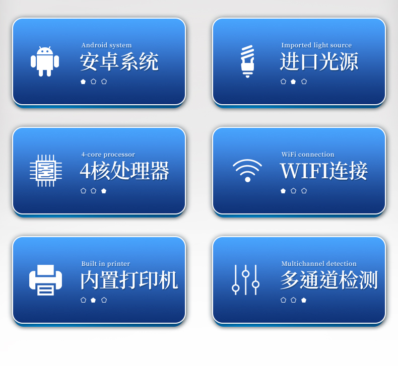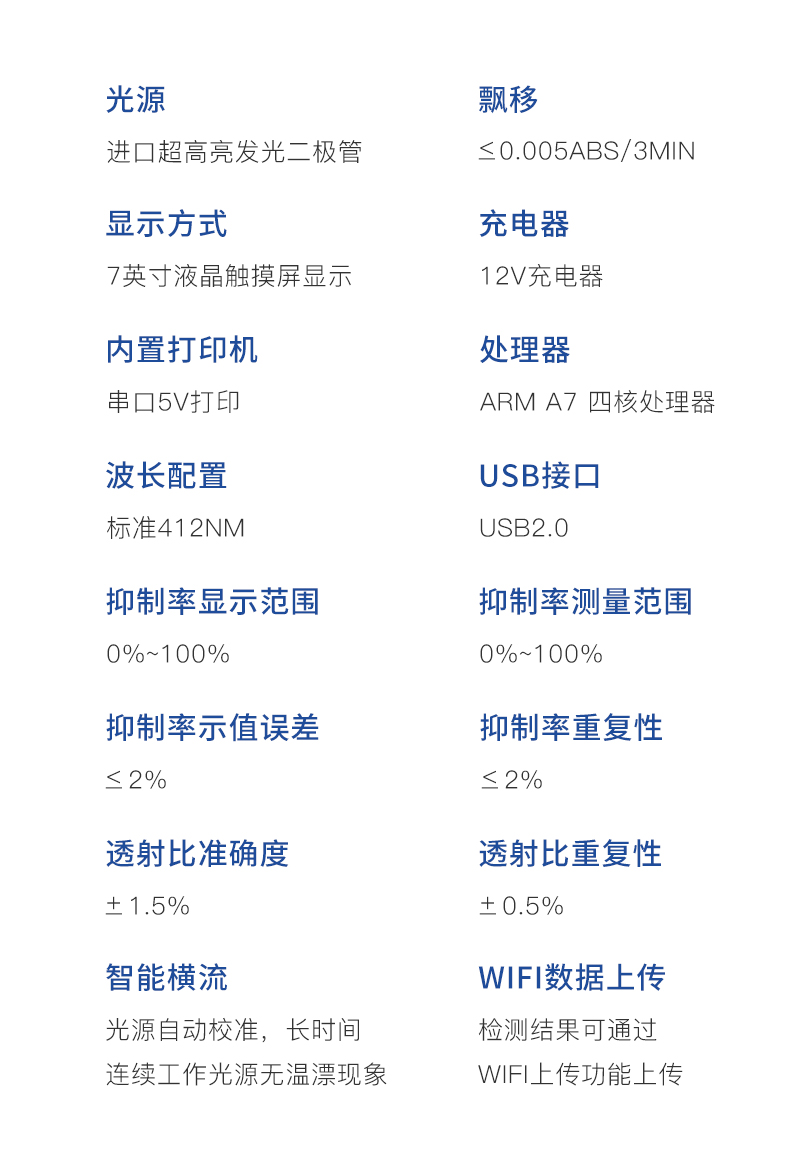 | 主控芯片采用ARM Cortex-A7,RK3288/4核處理器,主頻1.88Ghz,運轉速度更快速,穩定性更強。 | 顯示方式:7英寸液晶觸摸屏顯示,人性化中文操作界面,讀數直觀、簡單。 | 直流12V供電,可連接車載電源,可配6ah大容量充電鋰電池,方便戶外流動測試。 | 智能恒流穩壓,光強自動校準,長時間連續工作光源無溫漂現象。 | 不間斷進樣,連續檢測 | 樣本編號自動累加。 | 檢測項目可擴充。 | 檢測結果可批量打印,批量上傳。 | 檢測結果為Excel表格,連接電腦即可拷貝。 | 可配置大容量鋰電池,固件可升級 |
