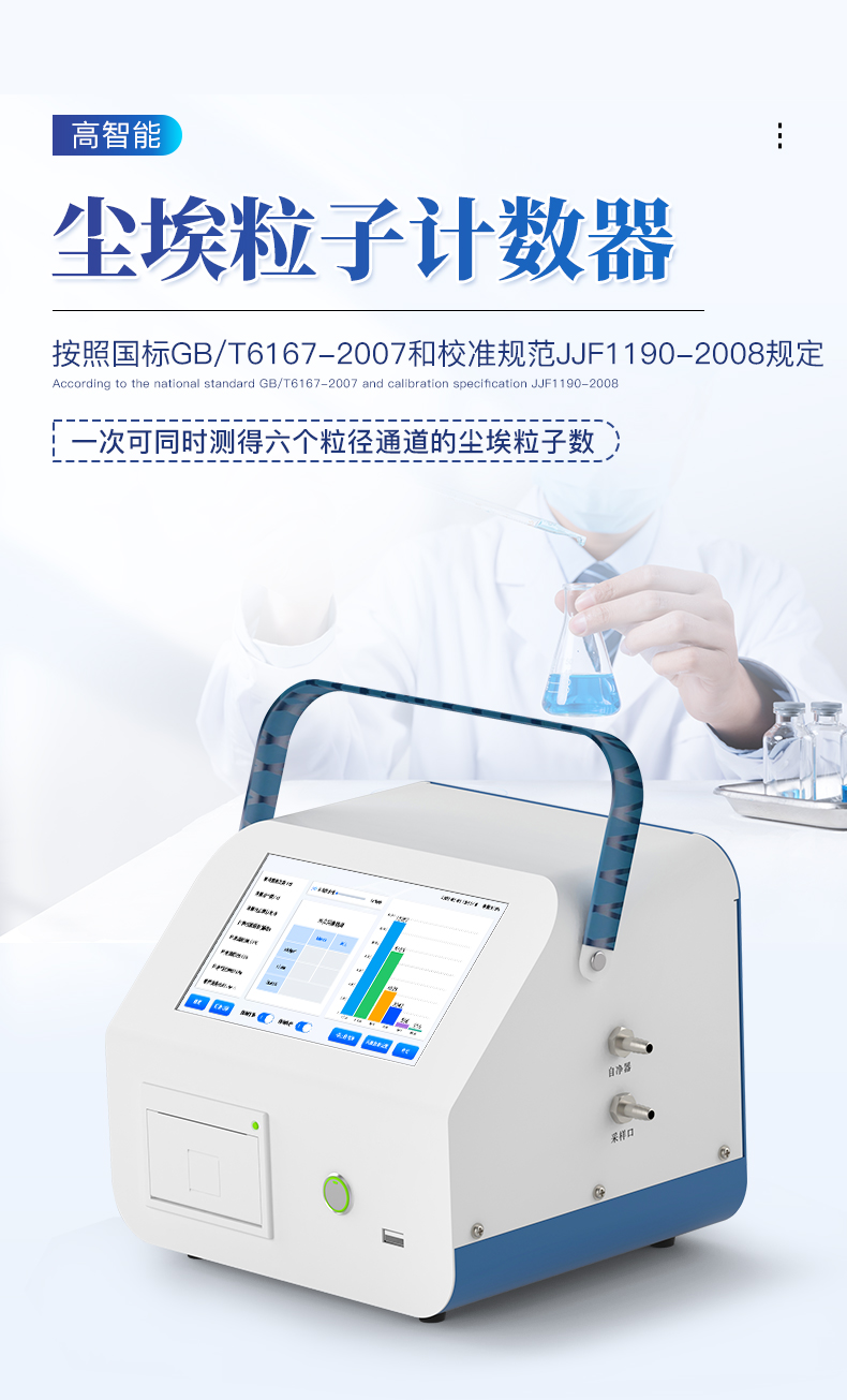 智能塵埃粒子計數器,其置信度測量檢定標準按照國標GB/T6167-2007和校準規范JJF1190-2008規定的條件,對凈化級別進行自動判斷。一次采樣可同時測得六個粒徑通道的塵埃粒子數,并同時顯示六個粒徑通道粒子的數目及其變化情況。