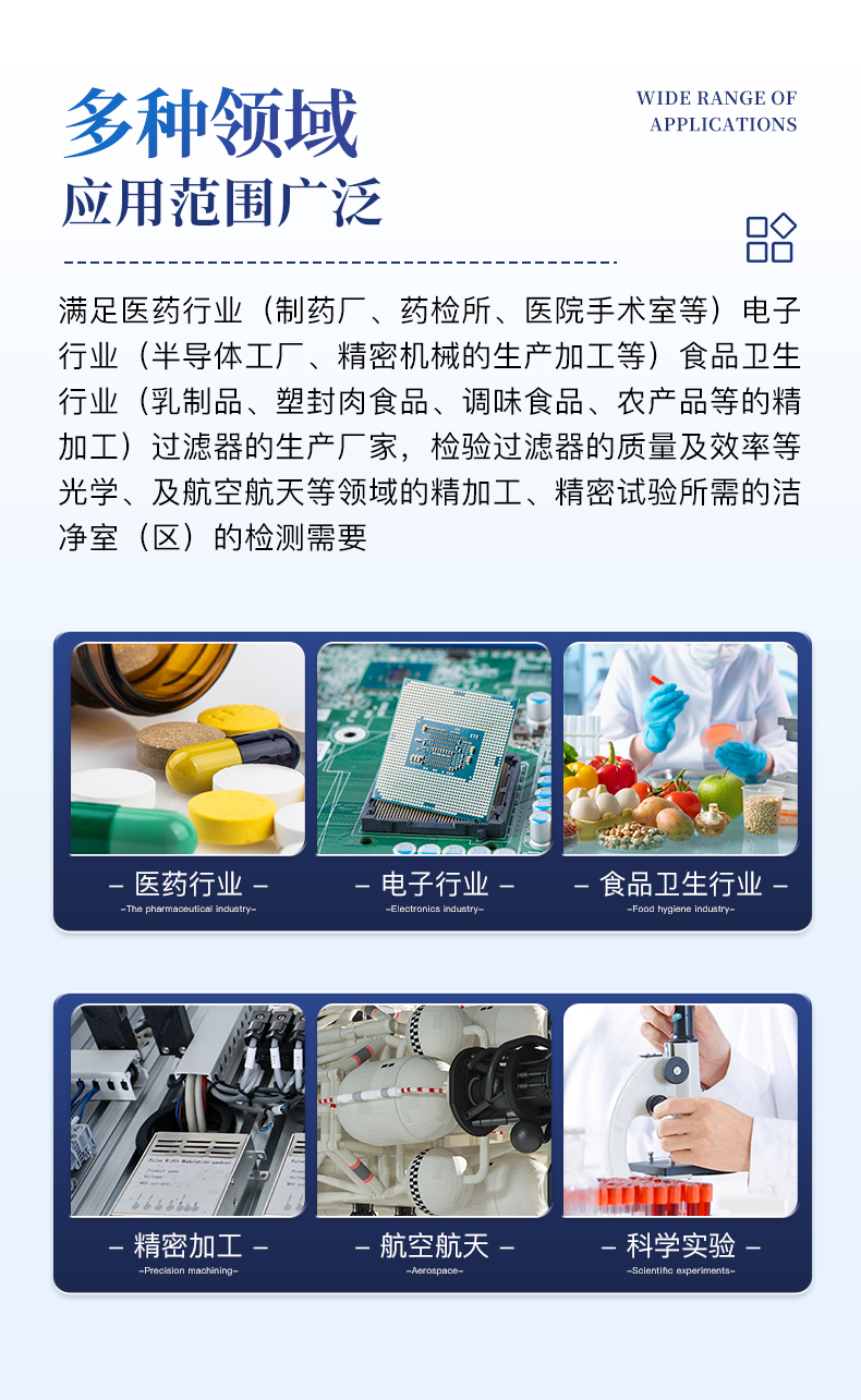 滿足醫藥行業(制藥廠、藥檢所、醫院手術室等);電子行業(半導體工廠、精密機械的生產加工等);食品衛生行業(乳制品、塑封肉食品、調味食品、農產品等的精加工);過濾器的生產廠家,檢驗過濾器的質量及效率等;光學、及航空航天等領域的精加工、精密試驗所需的潔凈室(區)的檢測需要。