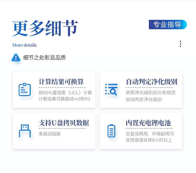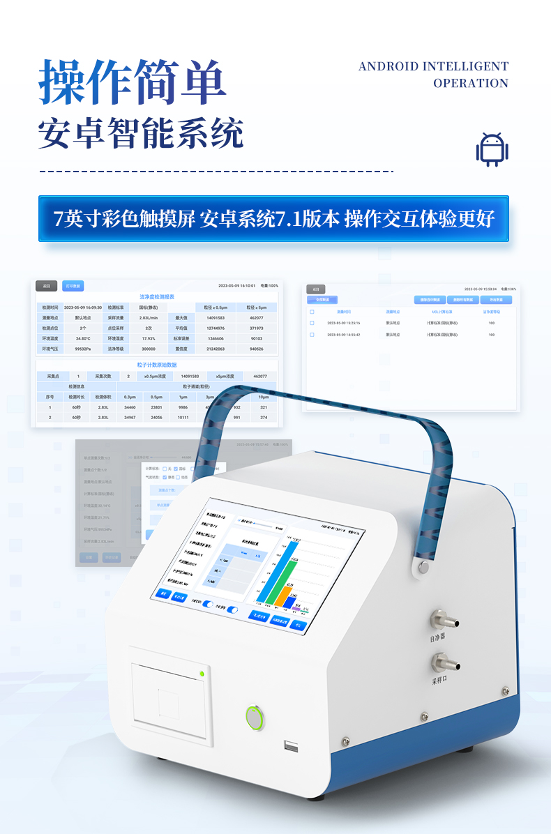 | 1、安卓系統7.1版本,操作交互體驗更好。 | 2、內置溫濕度傳感器、環境氣壓傳感器 | 3、核心部件光散射傳感器明顯消除腔體的雜散光,信噪比大為提高。從而使測量更準確更可靠。 | 4、按95%置信度(UCL)計算,計數結果可換算成m3和ft3 | 5、依照凈化級別劃分和規定,自動判定凈化級別,使用便利。 | 6、支持wifi、藍牙傳輸,數據可無線上傳;同時支持U盤拷貝數據,免驅動插拔。 | 7、配置監管平臺,檢測結果可直接無線傳至平臺,進行潔凈度長短期分析,輔助管理。 | 8、內置新一代高速熱敏打印機,可選擇所需要打印的粒徑通道,靈活打印結果。 | 9、交直流兩用,內置充電鋰電池,環保耐用可支持連續采樣6小時以上。 | 10、便捷簡易伸縮式云臺支架,安裝采樣操作更加方便。 |