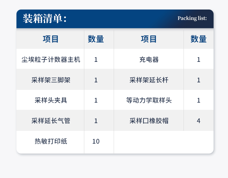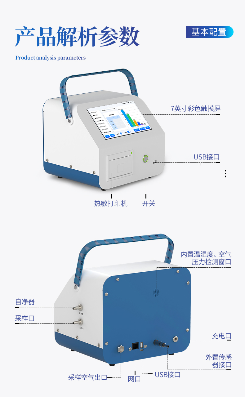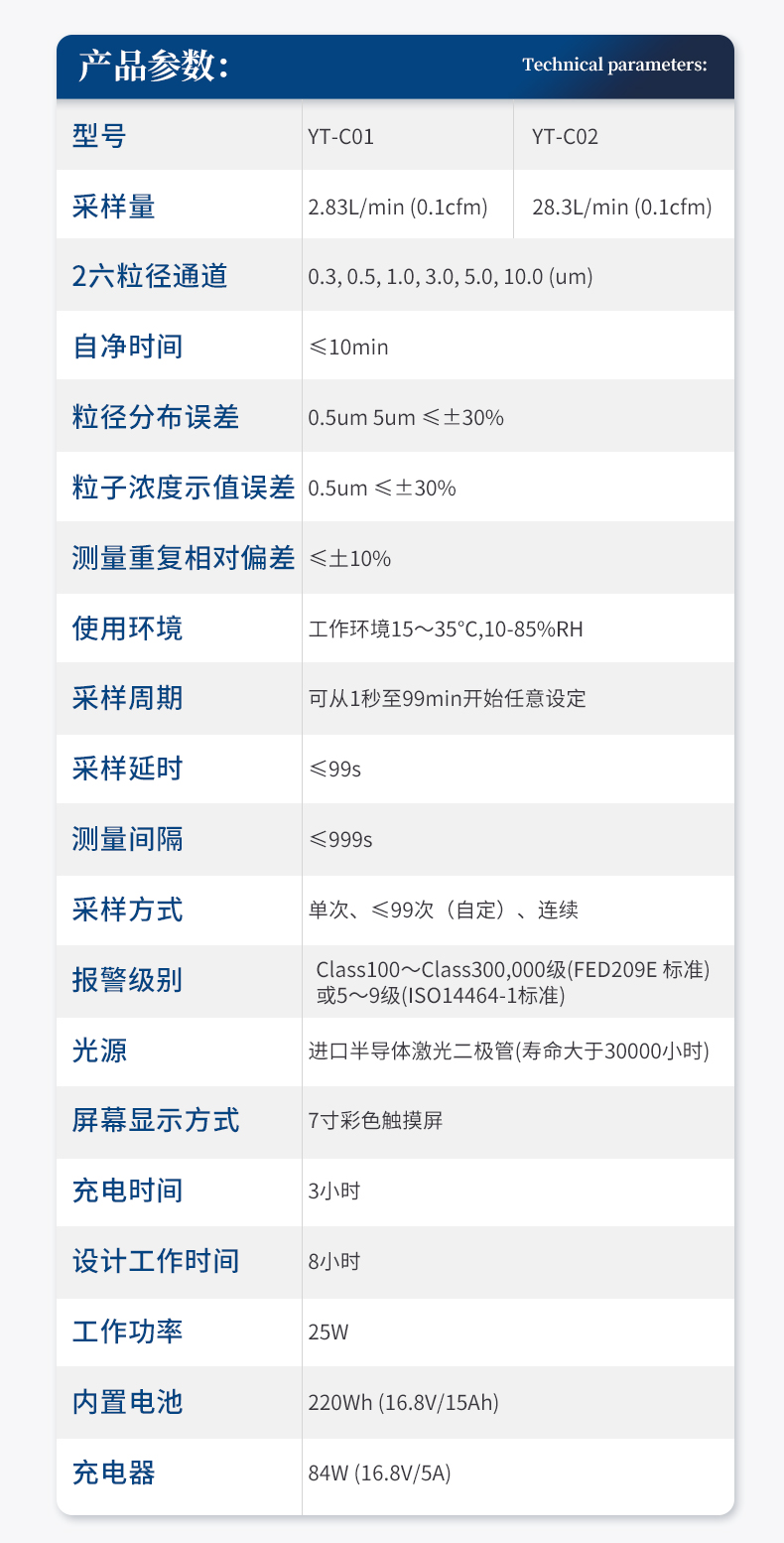 | 采樣量:2.83L/min (0.1cfm) | 六粒徑通道:0.3,0.5,1.0,3.0,5.0,10.0(μm) | 自凈時間:≤10min | 粒徑分布誤差:0.5um 5um ≤±30% | 粒子濃度示值誤差:0.5um ≤±30% | 測量重復相對偏差:≤±10% | 使用環境:工作環境15~35℃, 10-85%RH | 采樣周期:可從1秒至99min開始任意設定 | 采樣延時:≤99s | 測量間隔:≤999s | 采樣方式:單次、≤99次(自定)、連續 | 光源:進口半導體激光二極管(壽命大于30000小時) | 屏幕顯示方式:7寸彩色觸摸屏 | 數據內存容量:1--10萬條,可查詢,可導出。 | 充電時間:2小時 | 設計工作時間:8小時 | 平均功率:7.5W | 內置電池:74Wh(16.8V/5Ah) | 充電器:50W(16.8V/3A) |