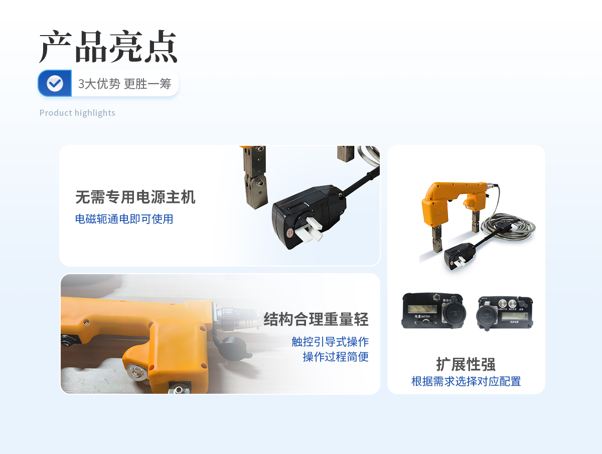 | 1、 無需專用電源主機,電磁軛通電即可使用; | 2、 體積小巧,重量輕; | 3、 開模制作,結構合理,手感舒適; | 4、 配專用儀器箱,電源配專用工作腰包 | 5、 逆變交流鋰電池可滿足不方便拖電源線,且需要采用交流磁化的的場所使用。 |