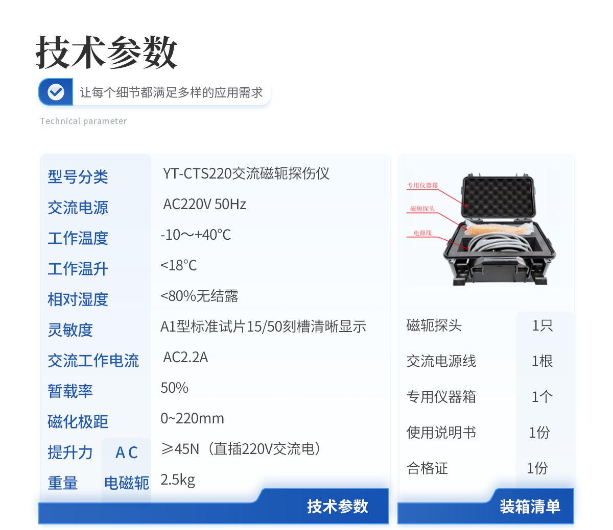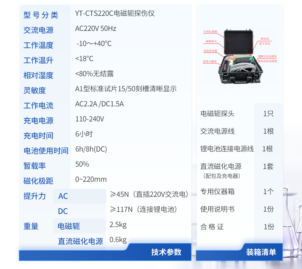 | 1.電磁軛探頭 1 只 | 2.鋰電池連接電源線 1 根 | 3.逆變交流磁化電源(配包及充電器) 1 套 | 4.專用儀器箱 1 個 | 5.使用說明書 1 份 | 6.合 格 證 1 份 |