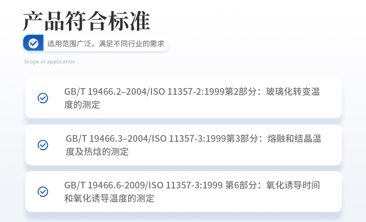 GB/T 19466.2–2004/ISO 11357-2:1999第2部分:玻璃化轉變溫度的測定 GB/T 19466.3–2004/ISO 11357-3:1999第3部分:熔融和結晶溫度及熱焓的測定 GB/T 19466.6-2009/ISO 11357-3:1999 第6部分:氧化誘導時間和氧化誘導溫度的測定