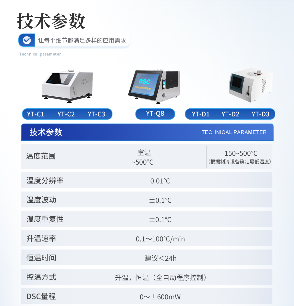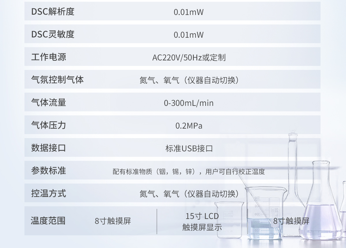 | 1.溫度范圍: 室溫~500℃ | 2.溫度分辨率: 0.01℃ | 3.溫度波動: ±0.1℃ | 4.溫度重復性: ±0.1℃ | 5.升溫速率: 0.1~100℃/min | 6.恒溫時間:建議<24h | 7.控溫方式:升溫,恒溫(全自動程序控制) | 8.DSC量程: 0~±600mW | 9.DSC解析度: 0.01mW | 10.DSC靈敏度: 0.01mW | 11.工作電源: AC220V/50Hz或定制 | 12. 氣氛控制氣體:氮氣、氧氣(儀器自動切換) | 13.氣體流量:0-300mL/min | 14.氣體壓力:0.2MPa | 15.顯示方式: 8寸 LCD觸摸屏顯示,超硬度儀器面膜設計。 |