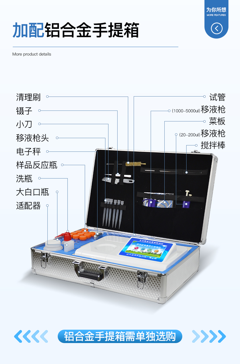 | 1、主控芯片采用ARM Cortex-A7,RK3288/4核處理器,主頻1.88Ghz,運轉速度更快速,穩定性更強。 | 2、顯示方式:7英寸液晶觸摸屏顯示,人性化中文操作界面,讀數直觀、簡單。 | 3、直流12V供電,可連接車載電源,可配6ah大容量充電鋰電池,方便戶外流動測試。 | 4、智能恒流穩壓,光強自動校準,長時間連續工作光源無溫漂現象。 | 5、不間斷進樣,連續檢測 | 6、樣本編號自動累加。 | 7、檢測項目可擴充。 | 8、檢測結果可批量打印,批量上傳。 | 9、檢測結果為Excel表格,連接電腦即可拷貝。 | 10、可配置大容量鋰電池,固件可升級 |