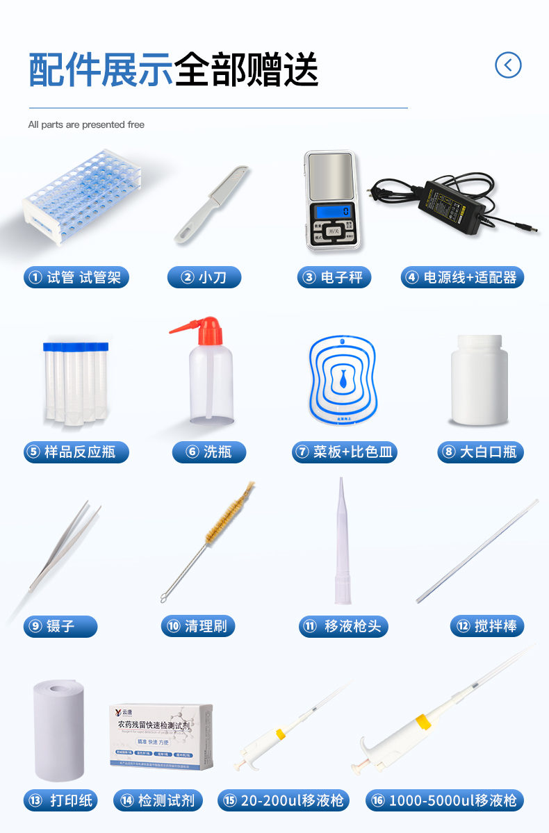 | 1. 檢測方法:蛋白質檢測方法符合【****】《NYT 1678-2008》 | 2. 儀器構成:由主機、樣品前處理器具和試劑包等構成,適于現場及實驗室使用 | 3. 光路系統:采用進口超高亮發光二極管,光源和檢測器采用全固態結構,準確度和精密度高、穩定性強、光源可控;采用光源自動開關節能設計,光源使用壽命達10萬小時以上。 | 4. 內置曲線:儀器具有內置工作曲線,無需配制標準溶液,只需要用配套試劑進行零點校正后,即可實現樣品的快速定量測定。 | 5. 測量方式:樣品顯色和測量為為標準1cm比色皿,無需轉移,提高檢測精密度。 | 6. 耗材配件:提供完備的專用前處理設備和耗材,一站式服務。 | 7. 專用試劑盒:配備專用的預制試劑,縮短試劑配制時間,操作簡單,使用方便。 |