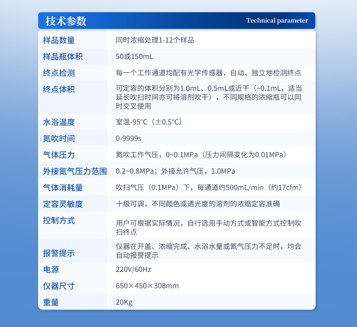 | 1、 樣品數(shù)量:可同時濃縮處理1~24個樣品; | 2、 濃縮瓶容積:100ml或150ml | 3、 終點檢測:每一個工作通道均配有光學(xué)化感器,自動、獨自檢測終點,無需人工看管; | 4、終點體積:自動感應(yīng)的定容體積人別為1.0ml、0.5ml或近干(約0.1ml,定容規(guī)格選配),適當(dāng)延長時間亦可將溶劑吹干,不同規(guī)格的濃縮瓶可以同時交叉使用; | 5、工作參數(shù)任意設(shè)置、控制和實時顯示:主要工作參數(shù),溫度、氮吹時間和氣體壓力; | 6、溫度設(shè)定:室溫~95℃(±0.5℃); | 7、氮吹時間:0~9999sec; | 8、氣體壓力:氮吹工作吹掃氣壓,0~0.50mpa范圍內(nèi)任意設(shè)定,儀器自帶自動調(diào)壓裝置,可自動調(diào)節(jié)至所設(shè)定的吹掃壓力并保持恒定,不受工作通道(樣品)突然開啟、關(guān)閉或數(shù)量的影響;外接氮氣壓力(氮氣鋼瓶分壓表壓力)范圍:0.10~0.50mpa;外接極限氣體壓力:0.7mpa; | 9、氣體消耗量:吹掃壓力(0.10mpa)下,每通道約500ml/min(約17cfm); | 10、定容靈敏度:十級可調(diào),不同顏色或透光度的溶劑的濃縮定容準(zhǔn)確; | 11、控制方式:用戶可根據(jù)實際情況,自行選用手動方式或智能方式控制吹掃終點; | 12、報警提示:儀器在開蓋、濃縮完成、氮氣壓力不足時,均會顯示; | 13、儀器運行中途開蓋,自動智能記憶工作狀態(tài),儀器繼續(xù)執(zhí)行之前被中止的程序,無需重新設(shè)置工作參數(shù)及工作通道; | 14、所有橡膠配件均采用無增塑劑的硅膠制造,避免樣品收到來自儀器的污染; | 15、靈活的工作參數(shù)設(shè)定、方便的樣品置入/取出過程,免去繁瑣的準(zhǔn)備工作,減低了有機溶劑對操作人員的毒害; | 16、密閉式結(jié)構(gòu)設(shè)計及自帶的強力排風(fēng)系統(tǒng)可將有機揮發(fā)成份和水蒸氣集體統(tǒng)一排出,避免了有機溶劑在實驗操作空間的揮發(fā)擴散,保障了操作人員的身體健康,并避免了對壞境的污染; | 17、儀器利用干式加熱方式,方便了用戶更換加熱用水; | 18、輸入電源:220V/60Hz; | 19、儀器重量:20kg |