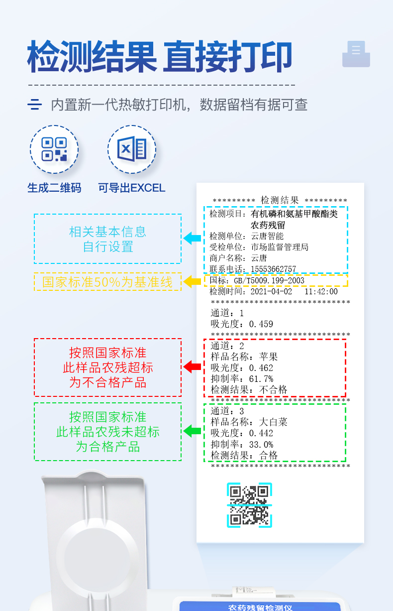 | 乙酰膽堿酯酶和丁酰膽堿酯酶試劑均可以使用,符合****和農業部標準的要求。 | 安卓智能操作系統,采用更加人性化操作,主控采用多核處理器,主頻1.88Ghz,運轉速度更快速,穩定性更強。 | 儀器具有4G無線遠傳、wifi聯網上傳、網線連接功能,快速上傳數據,進行數據管理與統計。 | 自動判斷樣品是否合格,檢測結果更加直觀。 | 儀器具有100多種蔬菜名稱菜單庫,分類管理,并可按需添加或刪除蔬菜名,編輯蔬菜名稱,可直接打印出蔬菜名稱。 | 檢測通道:8個檢測通道,可以同時測試多個樣品,循環檢測,即放即檢,每個樣品由程序控制分別獨立工作,不會互相干擾。 | 顯示方式:7英寸高靈敏真彩觸摸屏顯示,人性化中文操作界面,讀數直觀、簡單。 | 新一代高速打印機,可同時打印二維碼,打印格式為檢測人姓名、吸光度差值、檢測時間、檢測機構、樣品名稱及結果判定。 | 光源采用進口超高亮發光二極管,具有低功耗、高精度、穩定性強、光源可控可以關掉不使用的光源,響應速度快等優點。 | 智能恒流穩壓,光強自動校準,長時間連續工作光源無溫漂現象。 | 采用USB2.0接口設計,方便數據的存貯和移動,并可隨時與計算機直接相連,并且可用計算機控制儀器。實現數據查詢、瀏覽、分析、統計、打印等。 | 智能化程度高,儀器具有自檢功能,具有開機自檢和調零功能,具有自動檢測重復性功能 | 儀器具有自身保護功能,可設置用戶名及密碼,防止非工作人員操作等。 | 采用DC12v直流供電,安全系統更高,并且配備6A鋰電池充電器。 | 儀器具有重新校準、鎖定、恢復出廠設置功能。 |