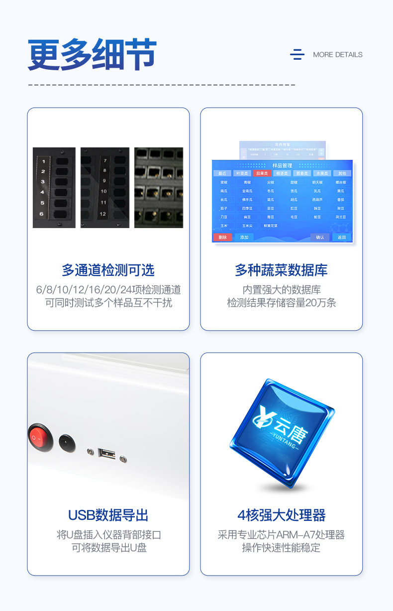 | 乙酰膽堿酯酶和丁酰膽堿酯酶試劑均可以使用,符合****和農業部標準的要求。 | 自動判斷樣品是否合格,檢測結果更加直觀。 | 儀器具有100多種蔬菜名稱菜單庫,分類管理,并可按需添加或刪除蔬菜名,編輯蔬菜名稱,可直接打印出蔬菜名稱。 | 檢測通道:10個檢測通道,可以同時測試多個樣品,循環檢測,即放即檢,每個樣品由程序控制分別獨立工作,不會互相干擾。 | 智能操作系統,采用更加人性化操作,主控采用多核處理器,主頻1.88Ghz,運轉速度更快速,穩定性更強。 | 顯示方式:7英寸高靈敏真彩觸摸屏顯示,人性化中文操作界面,讀數直觀、簡單。 | 打印機采用串口5v打印,可選擇手動打印或者自動打印,三分鐘出打印結果,打印格式為檢測人姓名、吸光度差值、檢測時間、檢測機構、樣品名稱及結果判定。 | 光源采用進口超高亮發光二極管,具有低功耗、高精度、穩定性強、光源可控可以關掉不使用的光源,響應速度快等優點。 | 智能恒流穩壓,光強自動校準,長時間連續工作光源無溫漂現象。 | 儀器具有GPRS遠傳功能,可插手機卡實現數據遠傳平臺,wifi聯網功能,可將數據快速上傳電腦,進行數據管理與統計。 | 采用USB2.0接口設計,方便數據的存貯和移動,并可隨時與計算機直接相連,并且可用計算機控制儀器。實現數據查詢、瀏覽、分析、統計、打印等。 | 智能化程度高,儀器具有自檢功能:具有開機自檢和調零功能,具有自動檢測重復性功能 | 儀器具有自身保護功能,可設置用戶名及密碼,防止非工作人員操作等。 | 采用DC12v直流供電,安全系統更高,并且配備6A鋰電池充電器。 | 儀器具有重新校準、鎖定、恢復出廠設置功能。 |