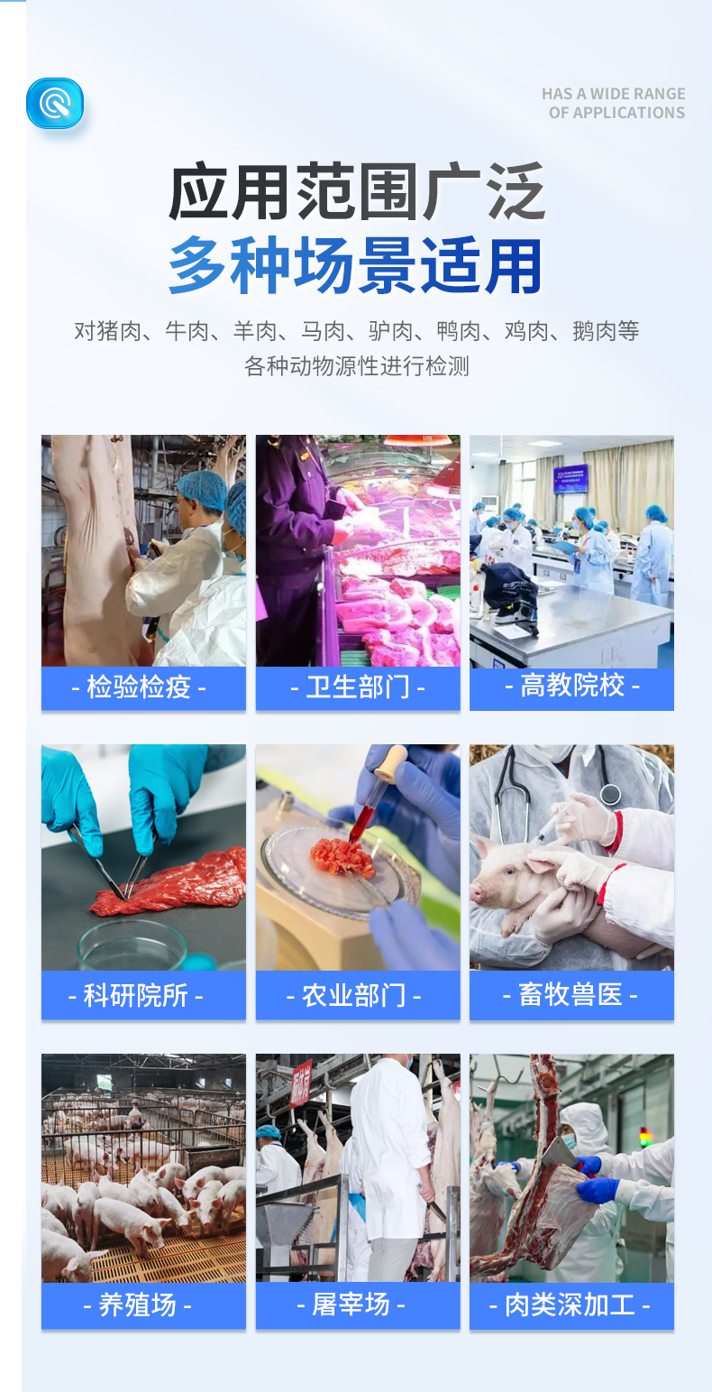 該儀器是一款**、便捷的食品檢測設備,專為識別肉類的真假而設計。可以對豬肉、牛肉、羊肉、馬肉、驢肉、鴨肉、雞肉、鵝肉等各種動物源性進行檢測。能夠迅速、準確地檢測肉類及肉源性種類,確保所食用的肉類真實可靠。檢測迅速準確,為各檢測單位提供專業的服務。