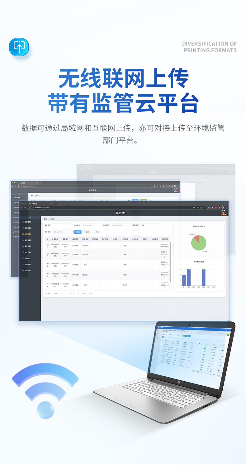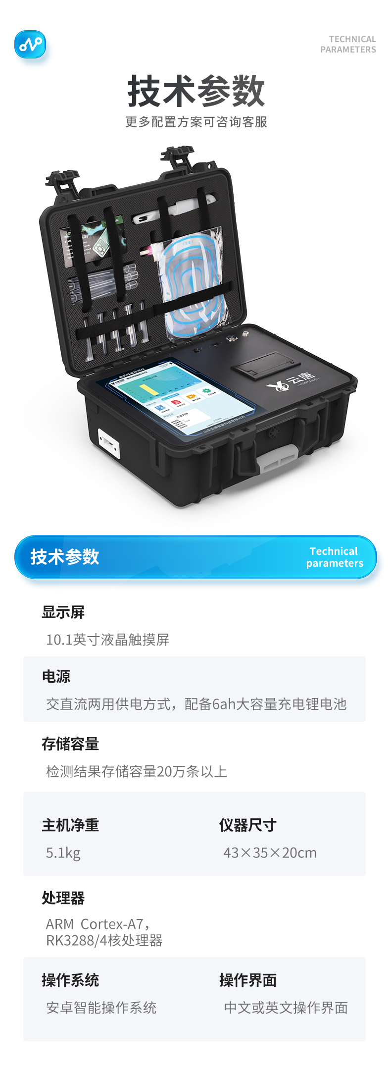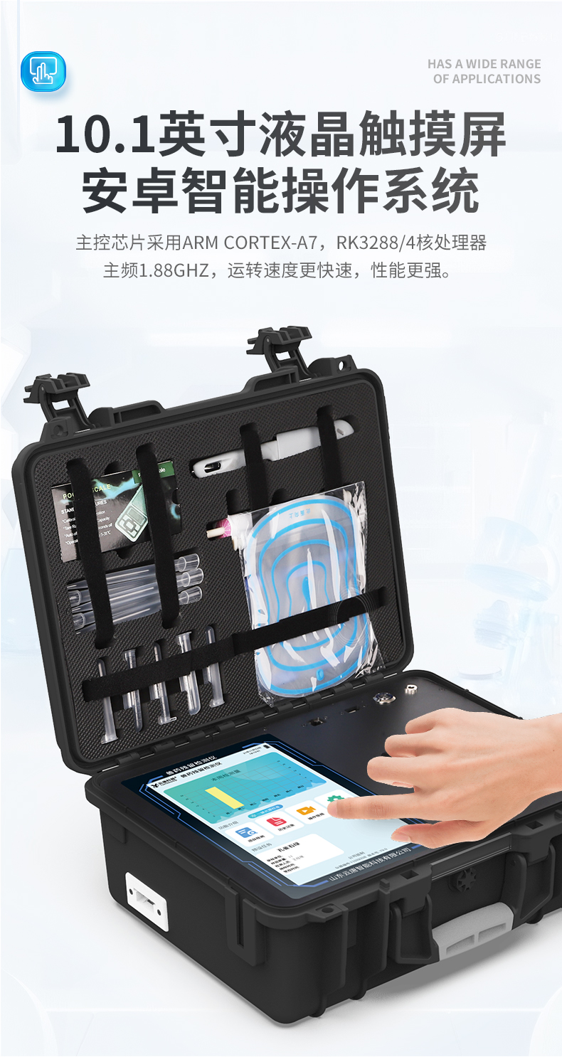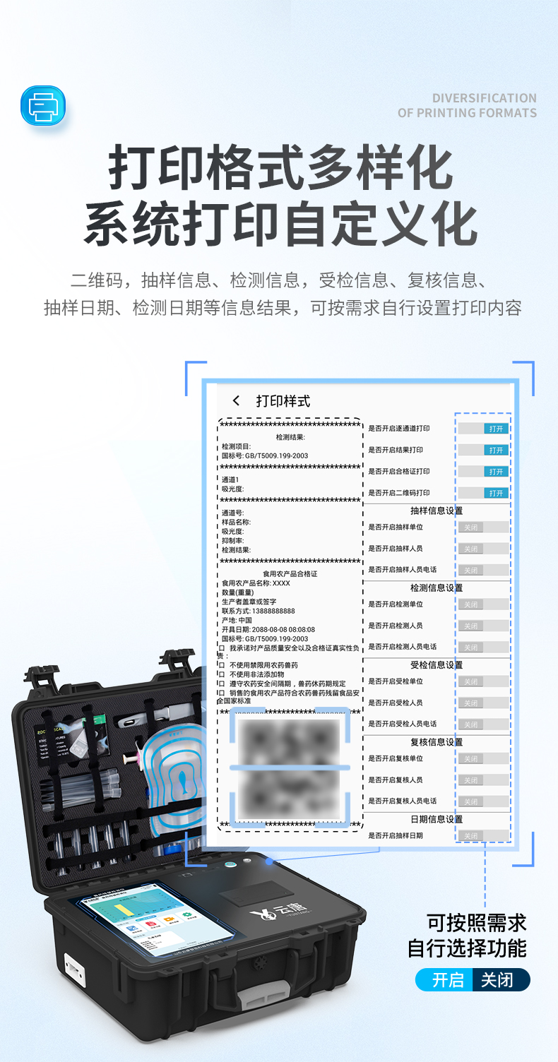 | 1、儀器采用10.1英寸液晶觸摸屏顯,搭配運行安卓智能操作系統,主控芯片采用ARM Cortex-A7,RK3288/4核處理器,主頻1.88Ghz,運轉速度更快速,性能更強。 | 2、儀器功能包括:膠體金檢測模塊、數字化管理模塊、無線通訊模塊等,可以滿足同一軟件下實現所有檢測項目的檢測,并在同一窗口展示檢測結果。 | 3、一體化便攜式快檢設備,采用交直流兩用供電方式,可連接車載電源,配備6ah大容量充電鋰電池,可以滿足現場及流動檢測使用的需求。儀器尺寸:43×35×20cm, 主機凈重:5.1kg | 4、系統自帶數據集成模塊,設備首頁自動統計檢測數據包含:周檢測數據、月檢測數據,全部檢測總數量,均包含檢測總數,合格數,不合格數,以及相關柱形分析圖,對各項檢測數據清晰掌握,無需電腦查詢,更加快捷直觀。 | 5、儀器具有任務預設模塊,可在樣品送檢前提前預設樣品名稱、檢測指標、送檢單位等信息,樣品送檢時一鍵調取保存信息,檢測更加方便快捷。 | 6、膠體金檢測模塊: 軌道式自動傳輸掃描方式,可實時顯示金標卡實時圖像,系統自動分析并呈現出CT曲線圖,CT線自動識別,無需手動調整,完成檢測后自動退出檢測卡。 結果判定線可修改,對照值標定值可保存,斷電不丟失數據。 兼容市場上其他膠體金卡,使用耗材不受限制,極大增強用戶使用體驗。 | 7、圖像調整功能:可根據金標卡讀取圖像進行多方位調整,使其更精準讀取結果。 | 8、儀器檢測系統擁有龐大數據庫,并且構建了完善的檢索、修訂功能。食品庫涵蓋多種樣品名稱,可按需添加或刪除、編輯樣品名稱;產品數據庫以及歷史檢測記錄支持一鍵檢索功能。 | 9、系統打印自定義化,打印格式多樣化,產品合格證(****要求),二維碼,抽樣信息、檢測信息,受檢信息、復核信息、抽樣日期、檢測日期等信息結果,可按需求自行設置打印內容。 | 10、A4紙版本報告打印功能:設備擁有兩種結果展示方式,可以自動生成A4打印模板和小票打印模板兩種樣式,可通過WiFi及網線等方式鏈接外置打印機可進行打印 | 11、儀器具有 wifi 聯網上傳、RJ45網線連接功能,可以快速上傳數據。同步對接監管平臺,數據可局域網和互聯網數據上傳,檢測結果直接傳至食品安全監管平臺。進行區域食品安全監管及大數據分析處理與數據統計,檢測區域食品安全長短期動態,達到食品安全問題預估、預警。 | 12、設備支持U盤存儲,標準USB接口,免驅動安裝。檢測結果存儲容量20萬條以上,可生成Excel表格,進行一鍵拷貝,并具有登錄保護功能,可設置用戶名及密碼,規范不同人員操作權限,防止非工作人員操作,并且可以進行重新校準、鎖定、恢復出廠設置功能。儀器固件可升級,后期檢測項目可擴充。 | 13、儀器具備遠程升級功能,可定向分客戶分儀器更新,開機后自動更新,并可持續性免費更新系統版本,無需像傳統產品返廠更新,節省時間及人力成本并避免了物流運輸返廠升級導致設備損壞的潛在風險。 |