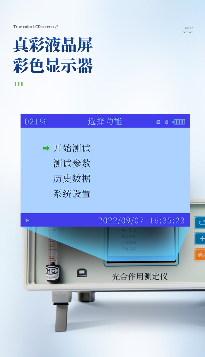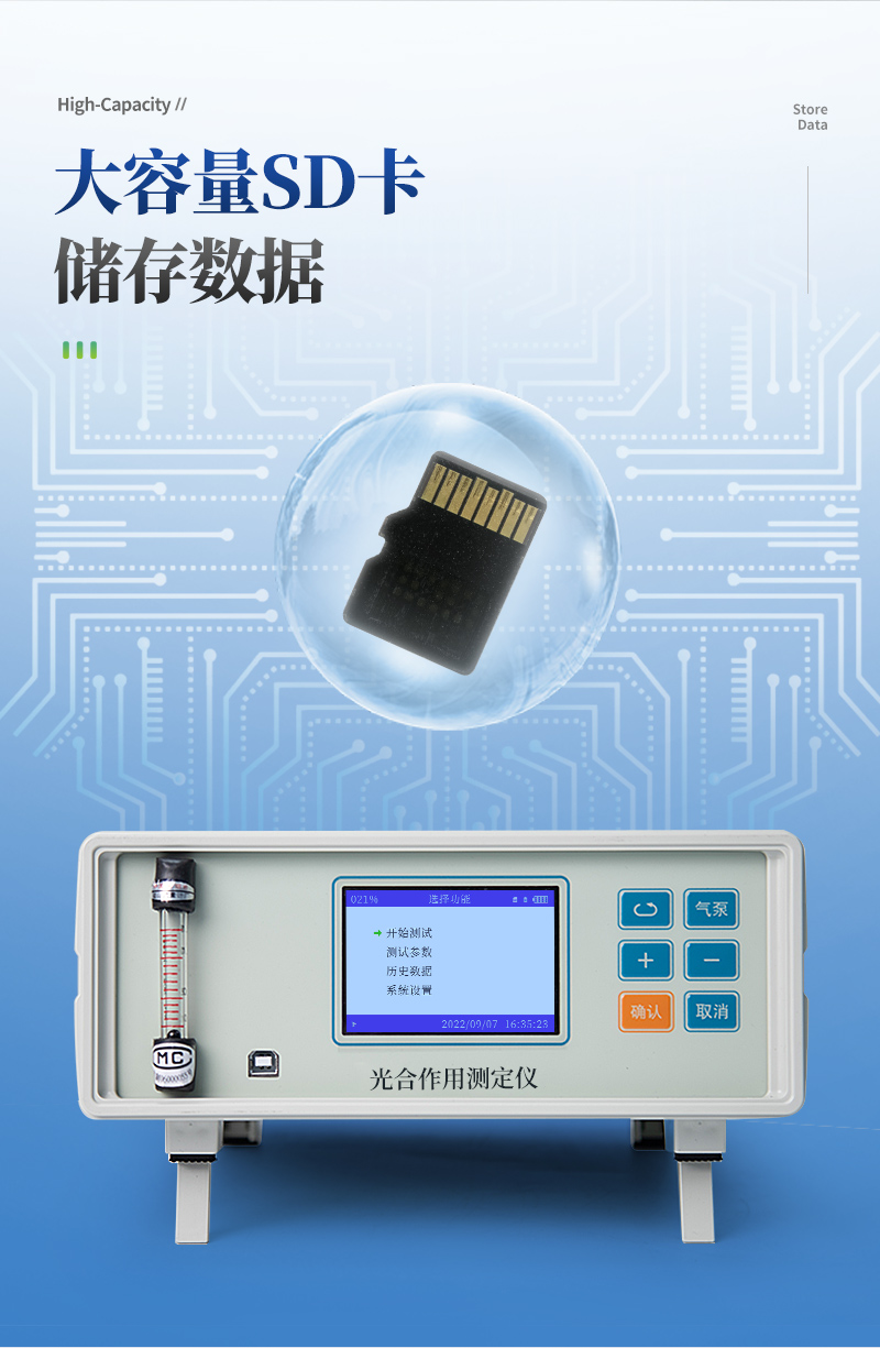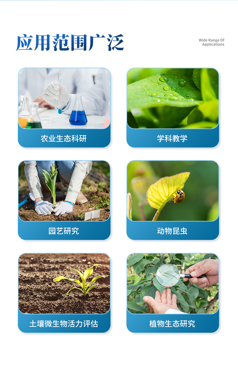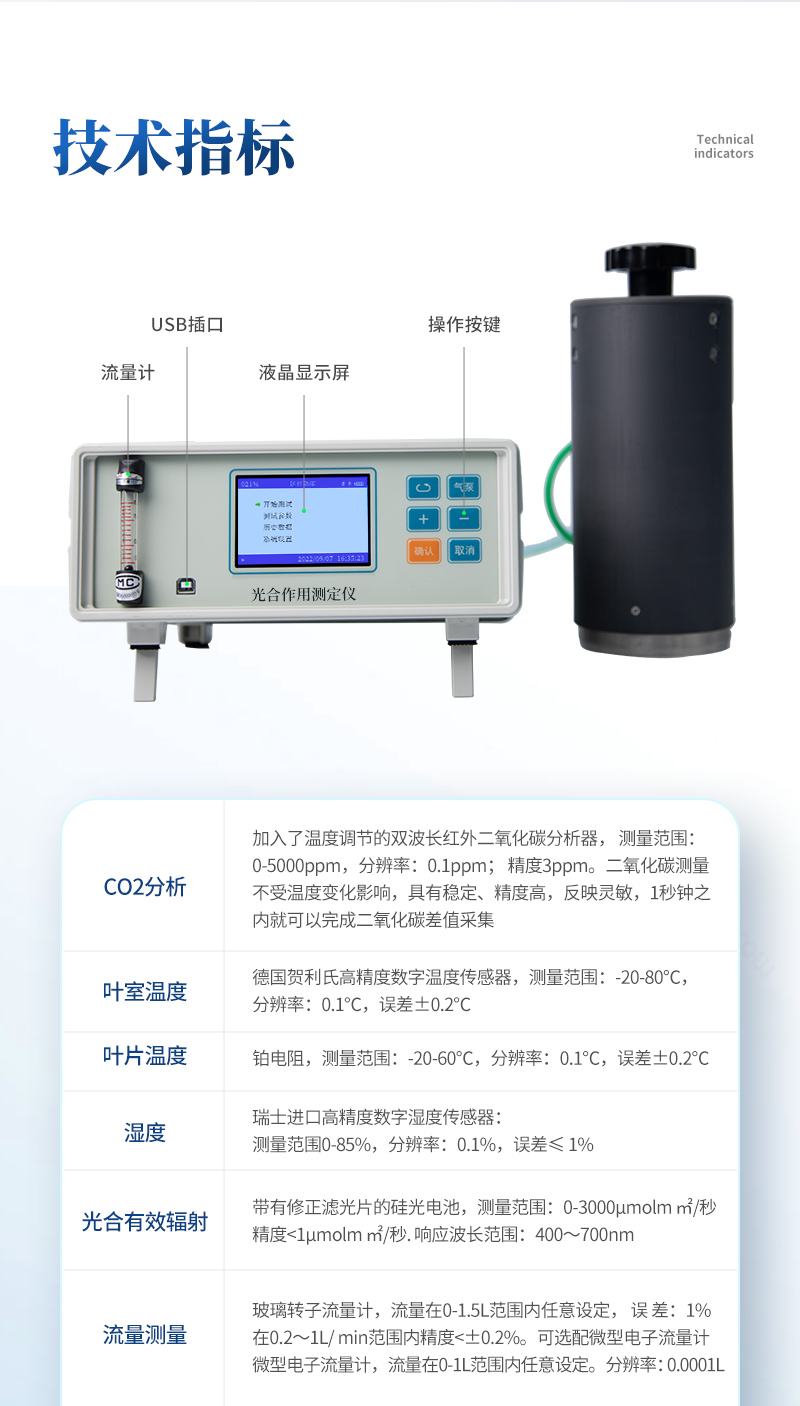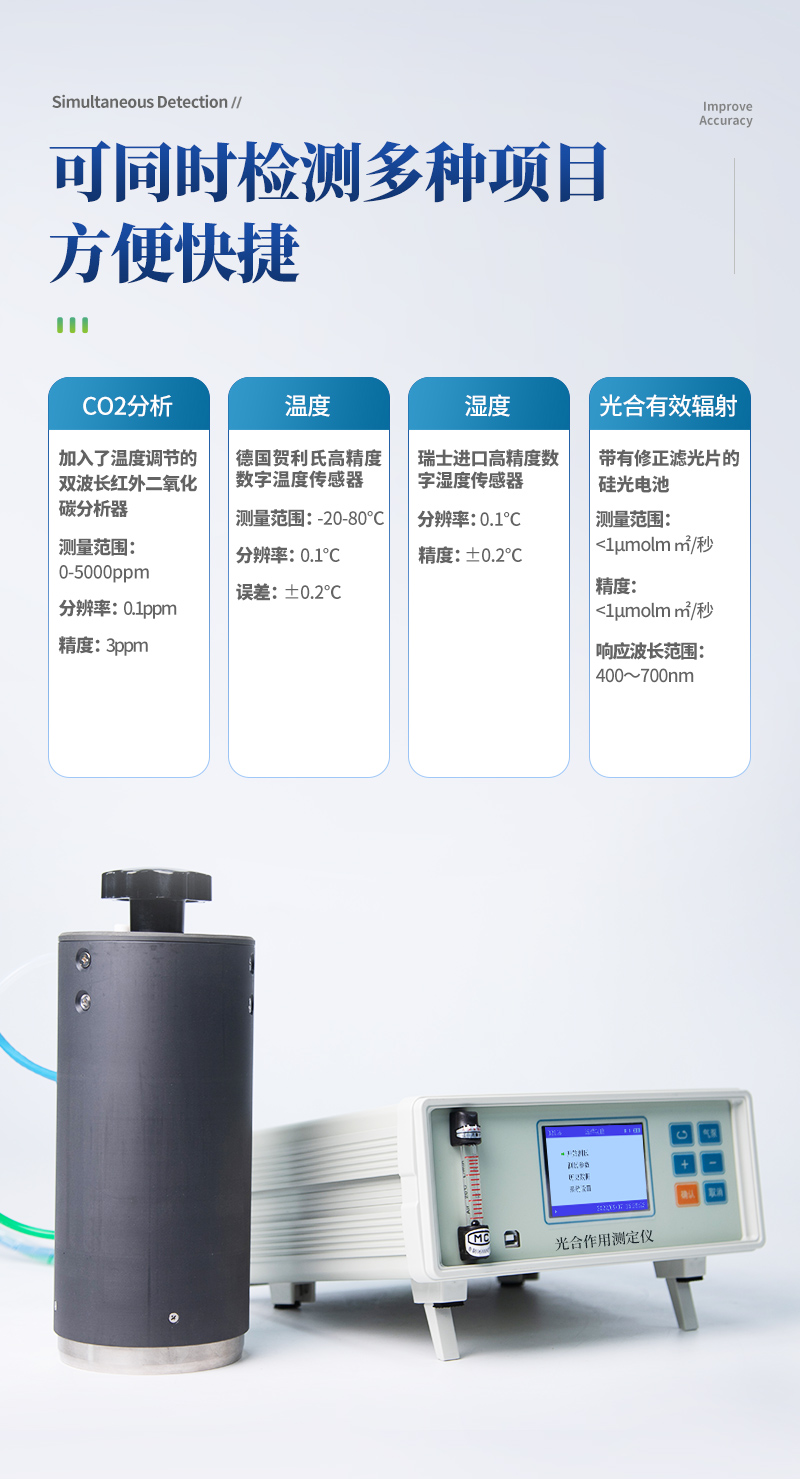 光合作用測定儀是通過測量植物葉片一定時間內CO2吸收(釋放)的量, 并同時測量空氣溫濕度,葉片溫度,光照強度以及同化CO2的葉片面積等要素,就可以直接計算出植物的光合速率、(呼吸速率)、蒸騰速率、細胞間CO2濃度和氣孔導度以及瞬時水分利用率等光合作用指標。該儀器具有靈敏度高、反應迅速,抗干擾性強,操作方便,可以進行活體的、連續的測定等突出優點,因而被廣泛應用于植物生理學、植物生物化學、生態環境、農業科學等多個領域。