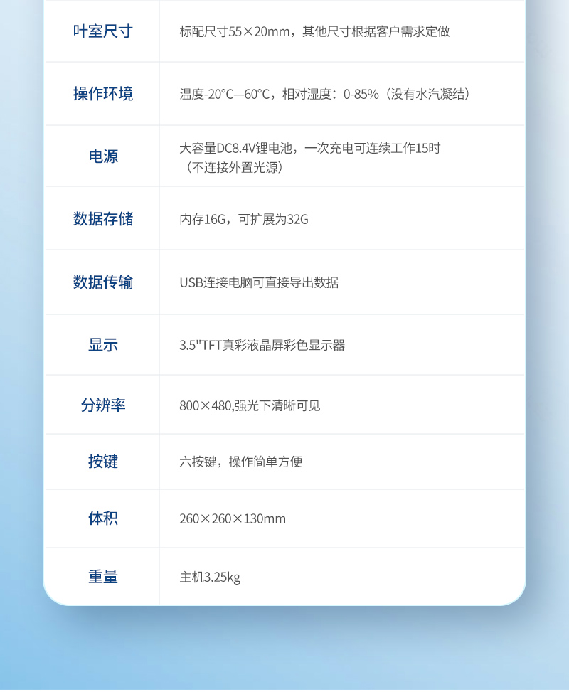 | Ⅰ型:(30×10mm) | Ⅱ型:(30×20mm) 標配尺寸 | Ⅲ型:(30×30mm) | Ⅳ型:(30*20mm) LED紅藍光源葉室 | 管道系統:本儀器采用對水分和CO2凝滯性、吸附性低的復合塑料軟管,即便是在高溫下也能保持良好性能,且內壁平滑。相比PVC或硅膠管該管有良好的疏水性。 | 大氣壓力: | 范圍:150~1150mbar | 分辨率:0.1mbar | 誤差:±1.5% | 操作環境:溫度-20℃—60℃,相對濕度:0-85%(沒有水汽凝結) | 電源:大容量DC8.4V充電鋰電池,一次充電可連續工作20小時(不連接外置光源) | 數據存儲:內存16G,可擴展為32G | 數據傳輸:USB連接電腦可直接導出數據 | 顯示:3.5"TFT真彩液晶屏彩色顯示器,分辨率 800×480,強光下清晰可見 | 按鍵:六按鍵,操作簡單方便,可設定修改日期,時間,測量間隔、數據采集次數以及試驗名稱。 | 語言選擇:中英文界面可一鍵切換。 | 體積:260×260×130mm | 重量:主機3.5kg |