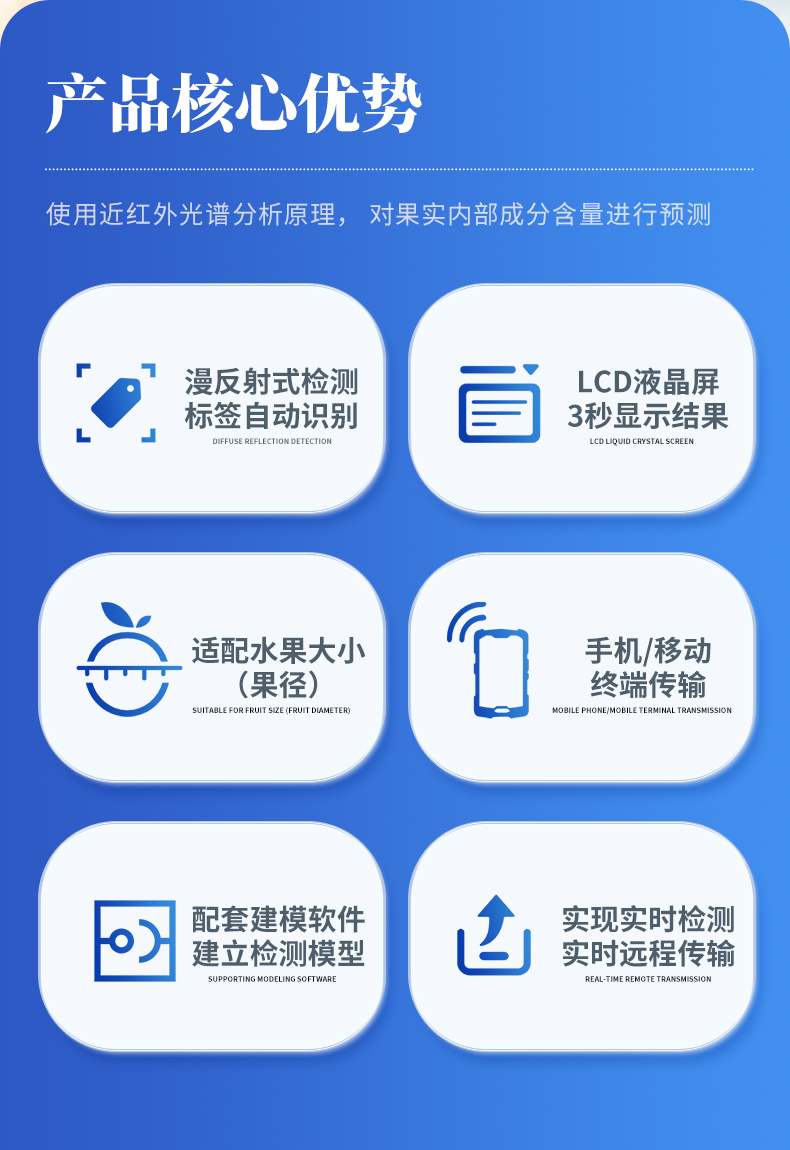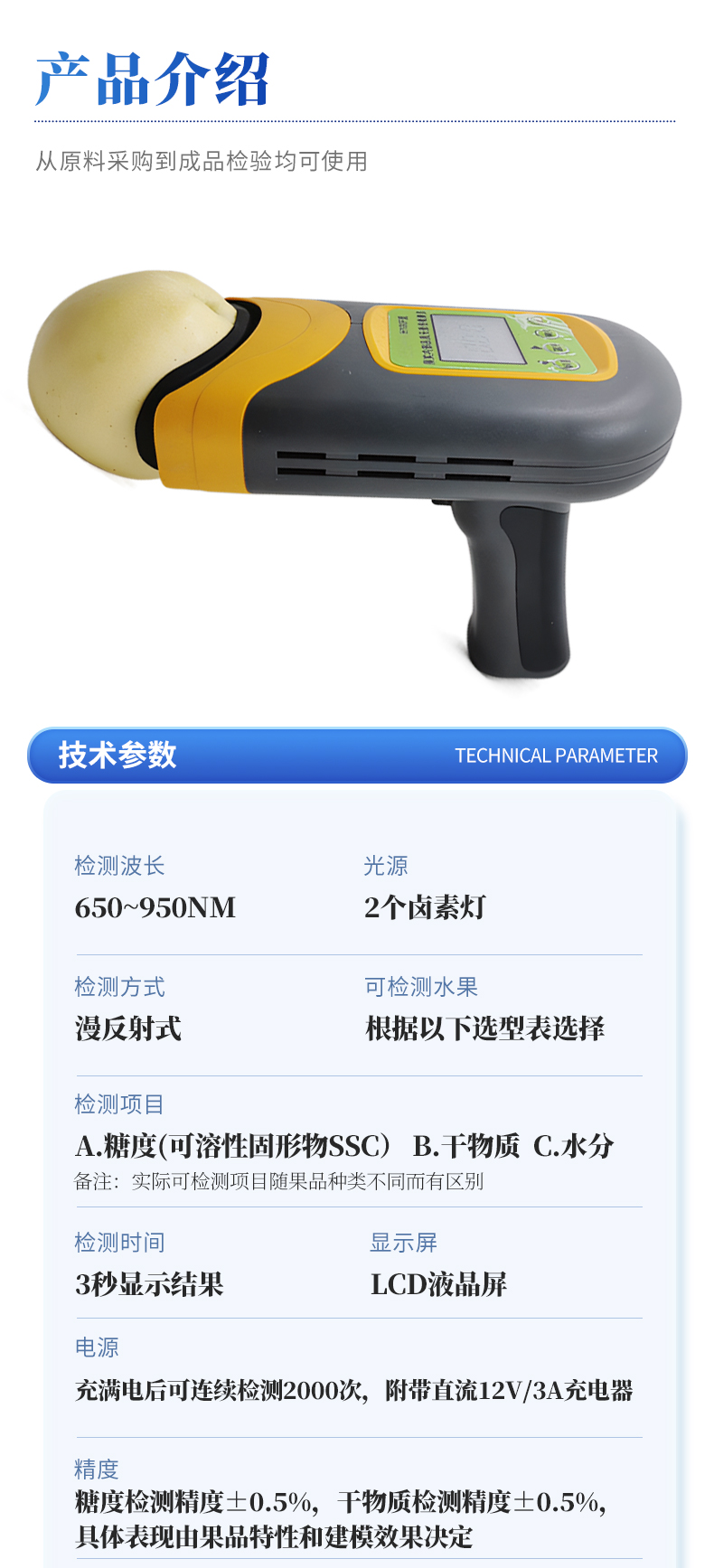 a.糖度(可溶性固形物SSC) b.干物質 c.水分 備注:實際可檢測項目隨果品種類不同而有區別 |