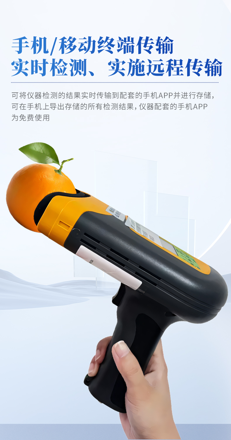 7.檢測時間:3秒顯示結果; | 8.電源:充滿電后可連續檢測2000次,附帶直流12V/3A充電器; | 9.精度:糖度檢測精度±0.5%,干物質檢測精度±0.5%,具體表現由果品特性和建模效果決定; | 10.檢測結果校正:帶有檢測值補償功能,可直接在儀器或軟件上腦操作調整;同時支持模型修正,可在配套設置軟件上直接操作; | 11.模型存儲:儀器可同時存儲多套檢測模型,檢測模型的名稱與存儲順序可由用戶通過配套軟件為儀器設定; | 12.數據傳輸:支持USB數據線傳輸,內置藍牙模塊支持無線傳輸; | 13.手機/移動終端傳輸功能:可將儀器檢測的結果實時傳輸到配套的手機APP并進行存儲,可在手機上導出存儲的所有檢測結果,儀器配套的手機APP為免費使用; | 14.提供傳輸協議,可供用戶進行二次開發,實現實時檢測、實施遠程傳輸數據的功能; | 15.標簽自動識別功能:內置RFID模塊,可自動識別帶有果樹編號的標簽卡; | 16.支持光譜信息存儲和導出; | 17.配套建模軟件:配備免費建模軟件,可由用戶自行建立檢測模型,也可由用戶導出原始光譜文件后自行建模;儀器也可導出光譜源文件,由用戶自主使用其他軟件建模; | 18.檢測結果存儲功能:儀器內部可記錄999組檢測結果,并可通過USB數據線和計算機連接,隨時導出檢測結果; | 19.操作環境:5~30℃,85%RH環境內使用 | 20.顯示屏:LCD液晶屏 | 21.電池信息:2000mA可充電鋰電池 | 22.尺寸:110×160×169mm,400g,ABS材質 | 23.附件:橡膠遮光罩,充電器,USB數據線,便攜箱,軟件(免費電子版) |
