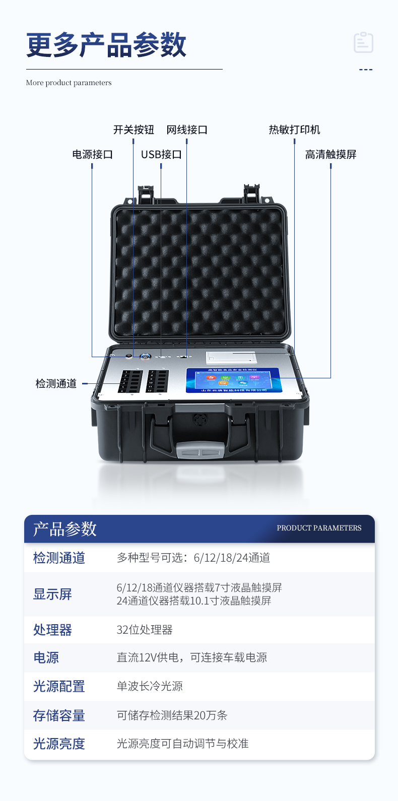 | 主控芯片采用ARM Cortex-A7,RK3288/4核處理器,主頻1.88Ghz,運(yùn)轉(zhuǎn)速度更快速,穩(wěn)定性更強(qiáng)。 | 顯示方式:7英寸液晶觸摸屏顯示,人性化中文操作界面,讀數(shù)直觀、簡(jiǎn)單。 | 交直流兩用,直流12V供電,可連接車載電源,可配6ah大容量充電鋰電池,方便戶外流動(dòng)測(cè)試。 | 四波長(zhǎng)冷光源,6個(gè)檢測(cè)通道,每個(gè)通道均配置410、520、590、630nm波長(zhǎng)光源,標(biāo)配**的光路切換裝置,專業(yè)光路切換功能可實(shí)現(xiàn)*多64波長(zhǎng),并且所有檢測(cè)項(xiàng)目可實(shí)現(xiàn)所有通道同時(shí)檢測(cè)。 | 智能恒流穩(wěn)壓,光強(qiáng)自動(dòng)調(diào)節(jié)與校準(zhǔn),長(zhǎng)時(shí)間連續(xù)工作光源無(wú)溫漂現(xiàn)象。 | 內(nèi)置新國(guó)家限量標(biāo)準(zhǔn),與所測(cè)結(jié)果進(jìn)行現(xiàn)場(chǎng)比對(duì),并持續(xù)更新標(biāo)準(zhǔn)。 | 不間斷進(jìn)樣,連續(xù)檢測(cè) | 樣本編號(hào)自動(dòng)累加。 | 數(shù)據(jù)無(wú)線上傳平臺(tái),并可從平臺(tái)導(dǎo)出為Excel表格。 | 檢測(cè)結(jié)果存儲(chǔ)容量20萬(wàn)條 | 同時(shí)支持U盤拷貝,標(biāo)準(zhǔn)USB接口,免驅(qū)動(dòng)插拔。 | 檢測(cè)項(xiàng)目可擴(kuò)充,固件可升級(jí) | 儀器尺寸:43×35×19cm, 主機(jī)凈重:5.1kg |