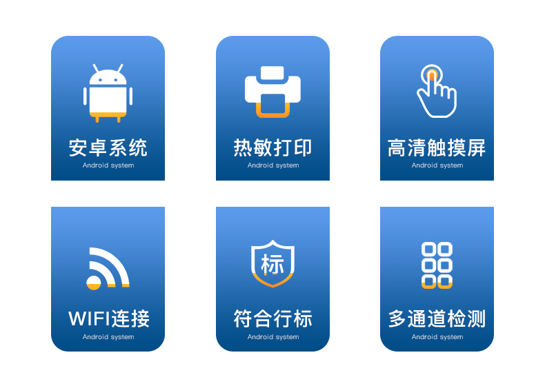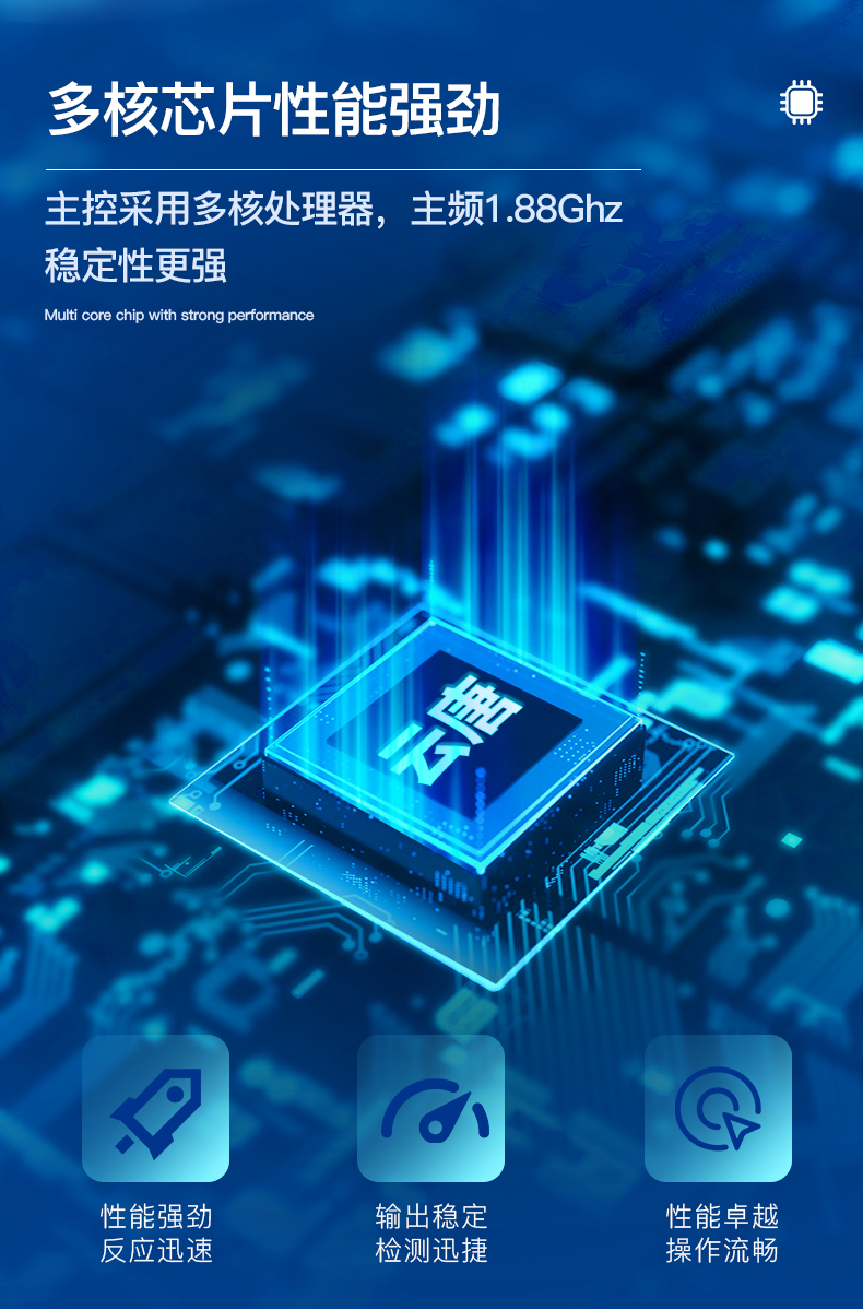 | 主控芯片采用ARM Cortex-A7,RK3288/4核處理器,主頻1.88Ghz,運轉速度更快速,穩定性更強。 | 顯示方式:7英寸液晶觸摸屏顯示,人性化中文操作界面,讀數直觀、簡單。 | 直流12V供電,可連接車載電源,可配6ah大容量充電鋰電池,方便戶外流動測試。 | 智能恒流穩壓,光強自動校準,長時間連續工作光源無溫漂現象。 | 不間斷進樣,連續檢測 | 樣本編號自動累加。 | 檢測項目可擴充。 | 檢測結果可批量打印,批量上傳。 | 檢測結果為Excel表格,連接電腦即可拷貝。 | 可配置大容量鋰電池,固件可升級 |