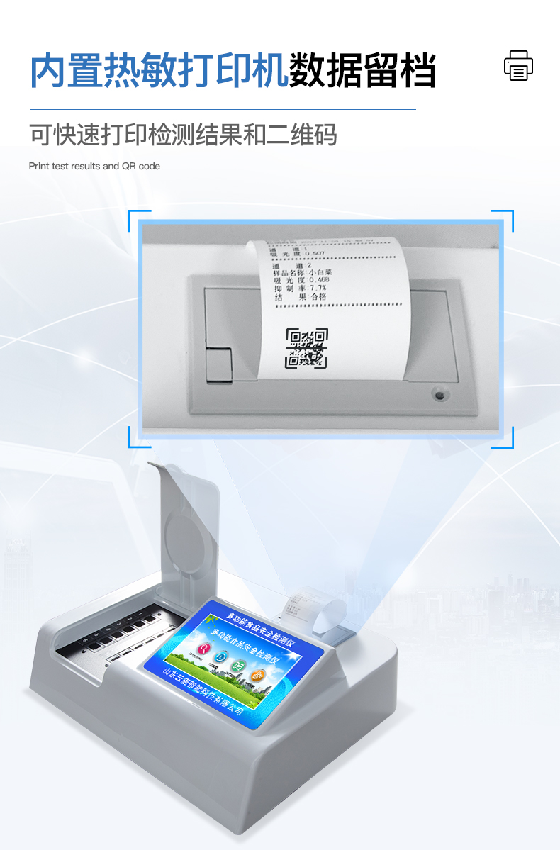 | 安卓智能操作系統,采用更加**和人性化操作,儀器具有網線連接、wifi聯網上傳、GPRS無線遠傳功能,快速上傳數據。 | 智能化程度高,儀器具有自檢功能:具有開機自檢和調零功能,具有自動檢測重復性功能。 | 檢測通道:≥12個檢測通道,可以同時測試多個樣品,每個樣品由程序控制分別獨立工作,不會互相干擾。 | 配備新一代嵌入式熱敏打印機,可選擇手動打印或者自動打印,檢測完成可自動打印檢測報告和二維碼。 | 采用標準USB2.0接口設計,支持U盤存儲,免驅動安裝,方便數據的存貯和移動,并可隨時與計算機直接相連,并且可用計算機控制儀器。實現數據查詢、瀏覽、分析、統計、打印等。 | 儀器帶有監管平臺。檢測結果可直接無線上傳。進行數據分析處理,檢測酒品等長短期動態,達到問題預估、預警。 | 儀器具有品類多種類樣品菜單庫,可靈活選擇檢測樣品,不同的檢測通道可同時檢測不同的樣品項目。 | 樣品處理簡單省力,整體操作快速、安全、便捷。 | 儀器具有自身保護功能,可設置用戶名及密碼,防止非工作人員操作等。 | 儀器具有重新校準、鎖定、恢復出廠設置功能。 |