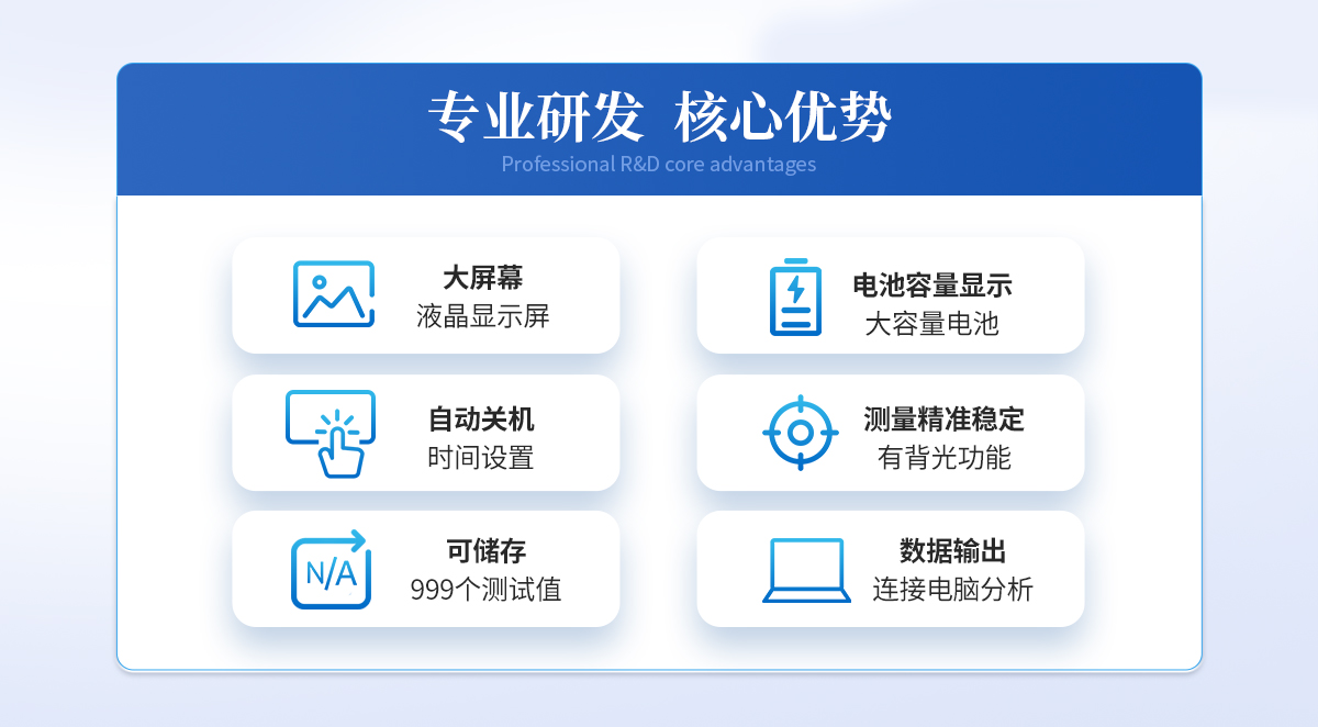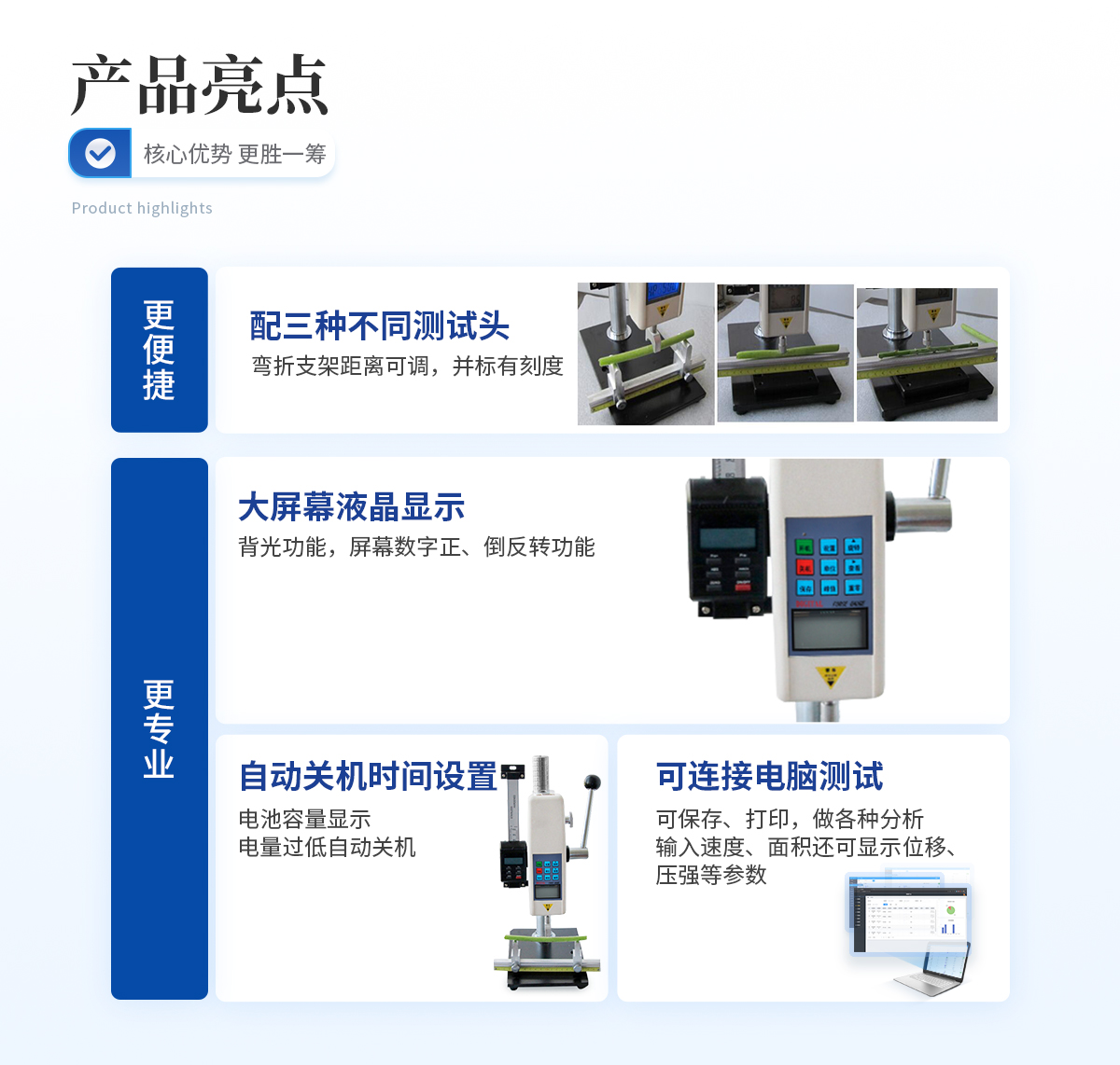| 1、三種不同測頭:可進(jìn)行莖桿彎折性能測量、莖稈抗壓強(qiáng)度測量、莖桿組織結(jié)構(gòu)(穿刺)強(qiáng)度測量;彎折支架距離可調(diào),并標(biāo)有刻度。 | 2、可配測位移標(biāo)尺 | 3、可連接電腦測試,可保存、打印,做各種分析,輸入速度、面積還可顯示位移、壓強(qiáng)等參數(shù); | 4、可儲存999個測試值; | 5、大屏幕液晶顯示,有背光功能,并具有屏幕數(shù)字正、倒反轉(zhuǎn)功能; | 6、自動關(guān)機(jī)時間設(shè)置; | 7、電池容量顯示,電量過低自動關(guān)機(jī)。 |