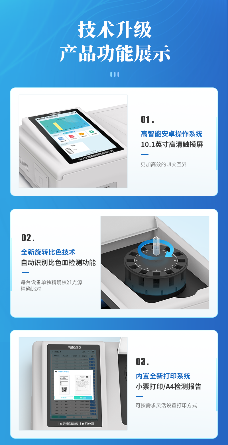 | 儀器采用臺式一體化系統檢測技術,將分光光度模塊、新型農殘檢測模塊、數字化管理模塊、無線通訊模塊高度集成于一體,支持檢測200種食品安全檢測項目,同時預留升級檢測方法。 | 儀器檢測模塊標準化、智能化,可隨意自由組合。檢測箱體內置多個標準檢測單元,檢測模塊可以調整配置。 | 儀器采用全新安卓智能系統,主控芯片采用 ARM Cortex-A7,RK3288/4核處理器,10.1寸高清液晶觸摸豎屏,更加**的UI交互界面,運轉快捷;儀器配備無線通信模塊: 4G(APN)通訊模塊、Wifi模塊,藍牙傳輸,同時具有雙USB接口以及RJ45接口能以多種方式實現數據保存和數據傳輸功能。 | 創新檢測模式: | ★檢測通道:≥12通道;采用精密旋轉比色池設計,使用同芯片同光源校準精度,解決不同光源之間的誤差值。1-12通道間誤差0.1%。(***:**202022821055.2) | ★儀器具有自動識別比色皿檢測功能,即:將樣品比色皿放入儀器后,點擊樣品檢測,儀器自動識別比色皿進行通道檢測。 | 進口高精光源: | 高精度進口四波長冷光源,通道配置 410、520、590、630nm 波長光源,一個光源芯片驅動一個光源,誤差極小,每臺設備單獨**校準光源,**比對,同時參照四種不同波段光源全方位覆蓋市面上99%的農殘食品項目檢測。 | 智能化操作系統: | 便捷操作系統:設備檢測時可在同一檢測界面自動對應相關檢測通道一次性選擇1-12個樣品名稱,無須退出界面,節省操作時間。 | 數據集成系統:設備首頁自動統計檢測數據包含:周檢測數據、月檢測數據,全部檢測總數量,均包含檢測總數,合格數,不合格數,以及相關柱形分析圖,對各項檢測數據清晰掌握,無需電腦查詢,更加快捷直觀。 | 項目預設系統:支持添加單個及多個相同或不相同的任務預設,一鍵快速調取,每一個任務分別可以設置不同的樣品、批次、編號、來源、備注、抽樣信息、檢測信息、受檢信息、復核信息等更多信息。無縫鏈接平臺和APP實時查看下發任務。 | 數據監管系統:同步對接監管平臺,數據可局域網和互聯網數據上傳,檢測結果可選擇直接傳至食品安全監管平臺。集成OSS輸出存儲服務、區分設備定向管理應用,進行區域食品安全監管及大數據分析處理與數據統計,檢測區域食品安全長短期動態,達到食品安全問題預估、預警。 | 自定義打印系統:內置全新打印系統,新創自定義打印方式,可按需靈活設置開啟或關閉:產品合格證(國家農業部標準要求),二維碼,抽樣信息、檢測信息,受檢信息、復核信息、抽樣日期、檢測日期等信息的打印。 | 系統遠程更新功能:可定向分客戶分儀器更新系統,按照不同客戶后期實際需求添加項目,無需機器返廠,即可遠程實時升級全新系統,節省時間成本及避免運輸造成設備損壞。 | 儀器主機采用一體化防水、抗壓、防撞擊、防腐蝕箱體設計,同時配備交直流供電,可連接車載電源,可選配大容量充電鋰電池,滿足現場野外檢測需求。 | 安全證書,放心保障:儀器具有中國計量科學研究院校準證書,權威認證。 |