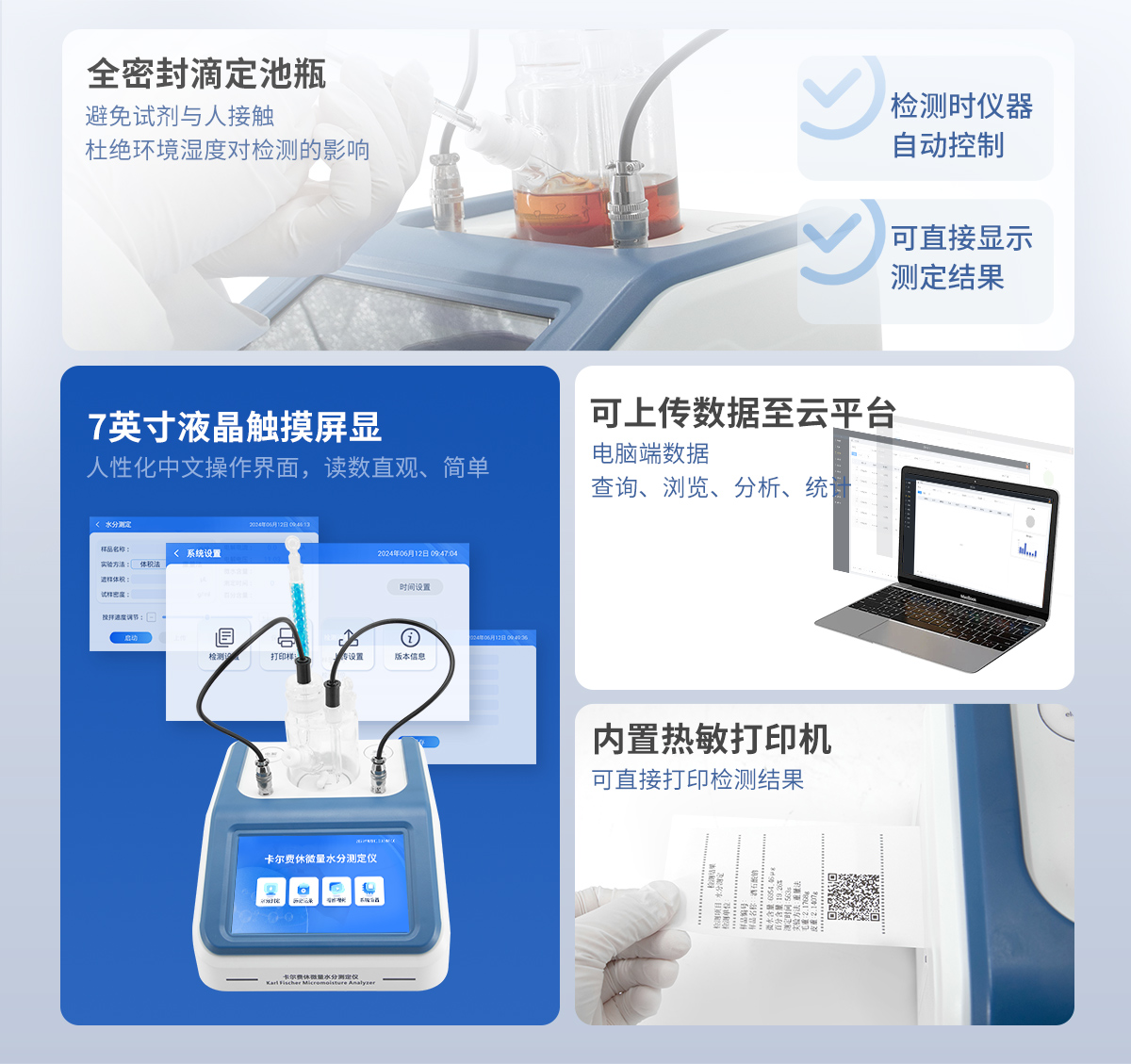 | 1.儀器主控芯片采用ARM Cortex-A7,RK3288/4核處理器,主頻1.88Ghz,運轉速度更快速,穩定性更強。 | 2.顯示方式:7英寸液晶觸摸屏顯示,人性化中文操作界面,讀數直觀、簡單。 | 3.儀器采用全密封滴定池瓶,避免試劑與人接觸,杜絕環境濕度對檢測的影響;檢測過程中儀器自動控制,攪拌、測定60秒左右完成,可直接顯示測定結果,無需人員頻繁操作。 | 4.儀器內置操作視頻,可直接觀看學習操作方法。 | 5.儀器可以測試多種樣品,循環檢測,即放即檢。 | 6.儀器可對樣品信息自由編輯,包括:樣品名稱、樣品編號、檢測單位、檢測人員、聯系方式、受檢單位等。 | 7.儀器可對檢測樣品測定信息進行設置,例如:電解電流、電解電壓、微量水分含量、測定時間、百分含量、進樣體積、試樣密度、毛重和皮重等。 | 8.水分檢測方式可根據實際需求選擇體積法或重量法。 | 9.內置熱敏打印機,可直接打印檢測結果,并可根據需求靈活設置打印內容(二維碼,樣品編號、檢測單位、檢測人員、聯系電話、受檢單位、檢測日期等)。 | 10.樣品檢測結果可通過二維碼掃碼查看。 | 11.檢測數據可通過歷史記錄進行檢索,通過設置檢測日期、樣品編號、檢測單位、檢測人員、樣品名稱、受檢單位等信息查找對應數據。 | 12.儀器配備標準USB接口,免驅動安裝。檢測結果存儲容量20萬條以上,可生成Excel表格進行拷貝。 | 13.儀器配備WiFi通信模塊,可上傳數據至云平臺,實現電腦端數據查詢、瀏覽、分析、統計等。 | 14.儀器可定向遠程更新,進行升級維護,無需返廠更新,節省時間及人力成本,避免了物流運輸導致設備損壞的潛在風險。 |