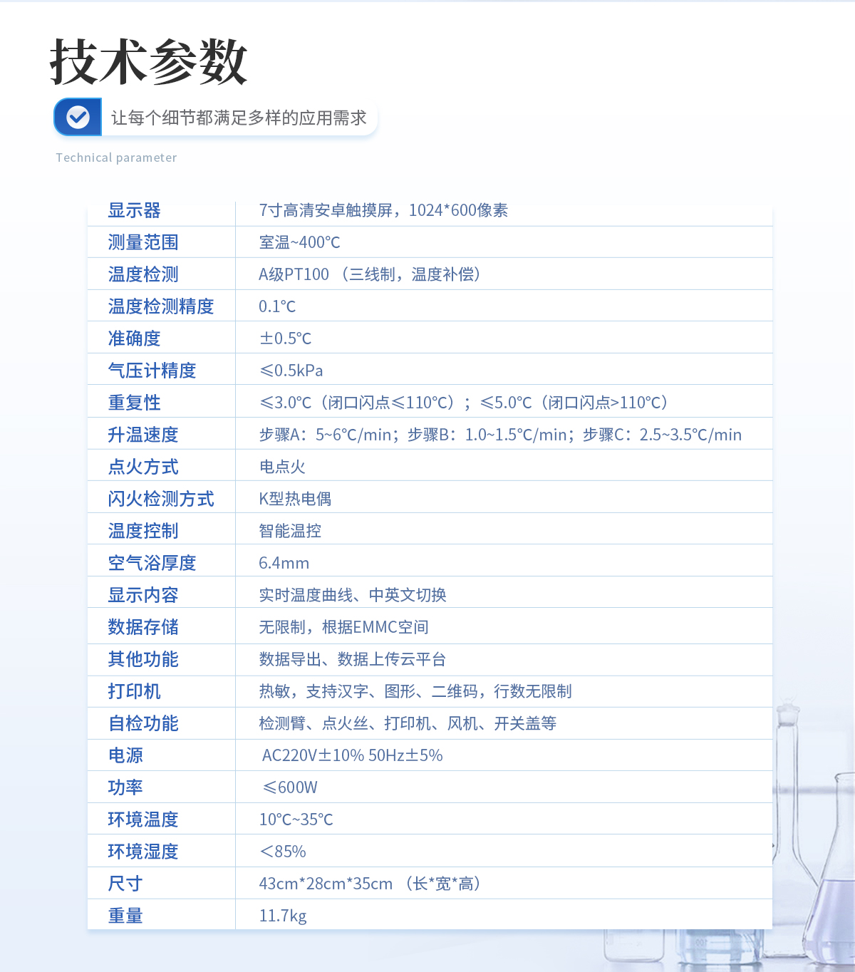 | 顯示器:7寸高清安卓觸摸屏,1024*600像素 | 測量范圍:室溫~400℃ | 溫度檢測: A級PT100 (三線制,溫度補償) | 溫度檢測精度:0.1℃ | 氣壓計精度: ≤0.5kPa | 重復性:≤4℃ | 升溫速度:預期閃點56℃前為14℃-17℃/min;預期閃點前23℃開始為5℃-6℃/min. | 點火方式:電點火 | 閃火檢測方式:火焰離子檢測 | 燃點功能:自動鎖定燃點值 | 冷卻方式:強制風冷 | 溫度控制:智能溫控 | 顯示內容:實時溫度曲線、中英文切換 | 數據存儲:無限制,根據EMMC空間 | 其他功能:數據導出、數據上傳云平臺 | 打印機:熱敏,支持漢字、圖形、二維碼,行數無限制 | 自檢功能:檢測臂、劃掃桿、點火絲、打印機、風機等 | 電源:AC220V±10% 50Hz±5% | 功率:≤600W | 環境溫度:10℃~35℃ | 環境濕度:<85% | 尺寸:43cm*28cm*35cm (長*寬*高) | 重量:11.3kg |