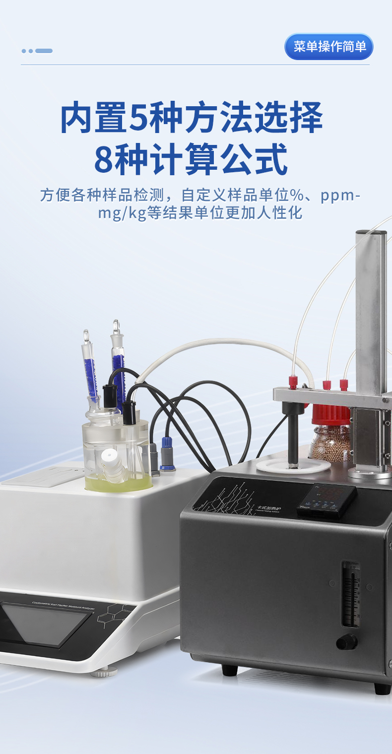 | 1. 采用高精度庫侖法水分測定儀與卡氏加熱爐聯用,**可以檢測到3μg水,精度達到ppm級; | 2. 空芯氣針進樣,和帶加熱功能的氣體輸送管路,零死體積水汽不凝結,操作更簡單,同時也很大的提高了儀器的準確性和重復性; | 3. 5.7寸高清電容觸摸屏,實時顯示測量參數,簡潔明了的功能菜單,全面的參數顯示,操作方便快捷 ; | 4. 內置5種方法可供選擇,8種計算公式方便各種樣品檢測,自定義樣品單位%、ppm、mg/kg等結果單位更加人性化; | 5. 系統實時檢測環境中的水分,精準扣除漂移,采用實時動態阻抗法判定滴定終點,測量結果更精準; | 6. **溫度300℃可以滿足大部分樣品檢測,氣流0-100ml可調,適合各種水分釋放速度的樣品; | 7. 操作方便,用戶只需要設置合適的溫度,合適的流量,把樣品放入事先準備好的樣品瓶,放入加熱器,然后把傳輸針扎入樣品瓶的硅膠墊,在儀器上點開始測量即可; | 8. 無需等待上一次樣品瓶冷卻之后才能進行下一次樣品測量,更換樣品瓶過程中樣品瓶始終保持密封狀態,測量效率更高更準確,尤其是吸濕性強的樣品無需擔心空氣中水分的干擾; | 9. 采用頂空進樣的方式,保證每個測定采用“新”的樣品瓶,樣品測定無交叉感染。樣品瓶體積小,確保較小的死體積和背景水分值。獨立密閉樣品瓶,測定時無需樣品轉移,結果更準確; | 10. 旋蓋式樣品瓶,無需專用且昂貴的壓蓋器和開蓋器,使用非常方便; | 11. 頂空進樣技術,只有氣體進入水分測定儀反應杯,不污染反應杯及電解電極。 |