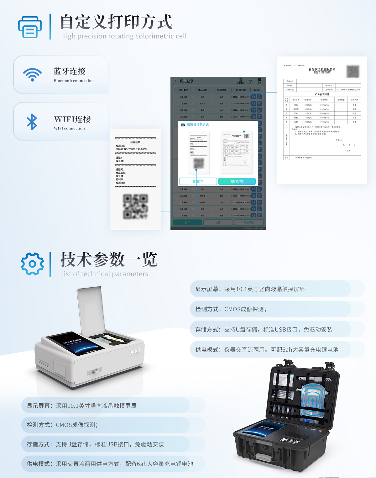 | 儀器采用10.1英寸液晶觸摸屏顯,搭配運(yùn)行安卓智能操作系統(tǒng),主控芯片采用ARM Cortex-A7,RK3288/4核處理器,主頻1.88Ghz,運(yùn)轉(zhuǎn)速度更快速,性能更強(qiáng)。 | 儀器功能包括:膠體金檢測(cè)模塊、數(shù)字化管理模塊、無(wú)線通訊模塊等,可以滿足同一軟件下實(shí)現(xiàn)所有檢測(cè)項(xiàng)目的檢測(cè),并在同一窗口展示檢測(cè)結(jié)果。 | 一體化便攜式快檢設(shè)備,采用交直流兩用供電方式,可連接車載電源,配備6ah大容量充電鋰電池,可以滿足現(xiàn)場(chǎng)及流動(dòng)檢測(cè)使用的需求。儀器尺寸:43×35×20cm, 主機(jī)凈重:5.1kg | 系統(tǒng)自帶數(shù)據(jù)集成模塊,設(shè)備首頁(yè)自動(dòng)統(tǒng)計(jì)檢測(cè)數(shù)據(jù)包含:周檢測(cè)數(shù)據(jù)、月檢測(cè)數(shù)據(jù),全部檢測(cè)總數(shù)量,均包含檢測(cè)總數(shù),合格數(shù),不合格數(shù),以及相關(guān)柱形分析圖,對(duì)各項(xiàng)檢測(cè)數(shù)據(jù)清晰掌握,無(wú)需電腦查詢,更加快捷直觀。 | 儀器具有任務(wù)預(yù)設(shè)模塊,可在樣品送檢前提前預(yù)設(shè)樣品名稱、檢測(cè)指標(biāo)、送檢單位等信息,樣品送檢時(shí)一鍵調(diào)取保存信息,檢測(cè)更加方便快捷。 | 軌道式自動(dòng)傳輸掃描方式,可實(shí)時(shí)顯示金標(biāo)卡實(shí)時(shí)圖像,系統(tǒng)自動(dòng)分析并呈現(xiàn)出CT曲線圖,CT線自動(dòng)識(shí)別,無(wú)需手動(dòng)調(diào)整,完成檢測(cè)后自動(dòng)退出檢測(cè)卡。 | 結(jié)果判定線可修改,對(duì)照值標(biāo)定值可保存,斷電不丟失數(shù)據(jù)。 | 兼容市場(chǎng)上其他膠體金卡,使用耗材不受限制,極大增強(qiáng)用戶使用體驗(yàn)。 | 儀器檢測(cè)系統(tǒng)擁有龐大數(shù)據(jù)庫(kù),并且構(gòu)建了完善的檢索、修訂功能。食品庫(kù)涵蓋多種樣品名稱,可按需添加或刪除、編輯樣品名稱;產(chǎn)品數(shù)據(jù)庫(kù)以及歷史檢測(cè)記錄支持一鍵檢索功能。 | 系統(tǒng)打印自定義化,打印格式多樣化,產(chǎn)品合格證(****要求),二維碼,抽樣信息、檢測(cè)信息,受檢信息、復(fù)核信息、抽樣日期、檢測(cè)日期等信息結(jié)果,可按需求自行設(shè)置打印內(nèi)容。 | A4紙版本報(bào)告打印功能(可選配):設(shè)備擁有兩種結(jié)果展示方式,可以自動(dòng)生成A4打印模板和小票打印模板兩種樣式,可通過(guò)WiFi及網(wǎng)線等方式鏈接外置打印機(jī)可進(jìn)行打印 | 儀器具有 wifi 聯(lián)網(wǎng)上傳、RJ45網(wǎng)線連接功能,可以快速上傳數(shù)據(jù)。同步對(duì)接監(jiān)管平臺(tái),數(shù)據(jù)可局域網(wǎng)和互聯(lián)網(wǎng)數(shù)據(jù)上傳,檢測(cè)結(jié)果直接傳至食品安全監(jiān)管平臺(tái)。進(jìn)行區(qū)域食品安全監(jiān)管及大數(shù)據(jù)分析處理與數(shù)據(jù)統(tǒng)計(jì),檢測(cè)區(qū)域食品安全長(zhǎng)短期動(dòng)態(tài),達(dá)到食品安全問(wèn)題預(yù)估、預(yù)警。 | 設(shè)備支持U盤存儲(chǔ),標(biāo)準(zhǔn)USB接口,免驅(qū)動(dòng)安裝。檢測(cè)結(jié)果存儲(chǔ)容量20萬(wàn)條以上,可生成Excel表格,進(jìn)行一鍵拷貝,并具有登錄保護(hù)功能,可設(shè)置用戶名及密碼,規(guī)范不同人員操作權(quán)限,防止非工作人員操作,并且可以進(jìn)行重新校準(zhǔn)、鎖定、恢復(fù)出廠設(shè)置功能。儀器固件可升級(jí),后期檢測(cè)項(xiàng)目可擴(kuò)充。 | 儀器具有重新校準(zhǔn)、鎖定、恢復(fù)出廠設(shè)置功能。 | 儀器具備遠(yuǎn)程升級(jí)功能,可定向分客戶分儀器更新,開(kāi)機(jī)后自動(dòng)更新,并可持續(xù)性免費(fèi)更新系統(tǒng)版本,無(wú)需像傳統(tǒng)產(chǎn)品返廠更新,節(jié)省時(shí)間及人力成本并避免了物流運(yùn)輸返廠升級(jí)導(dǎo)致設(shè)備損壞的潛在風(fēng)險(xiǎn)。 |