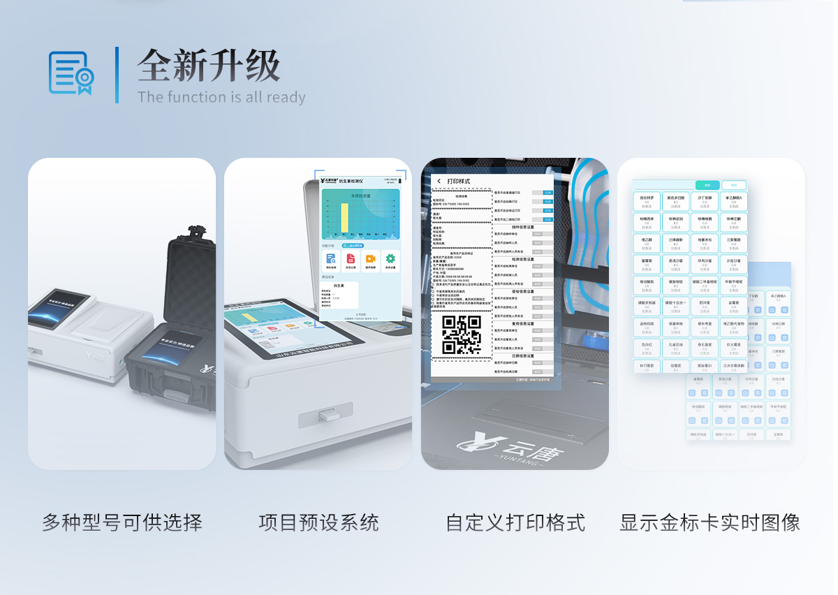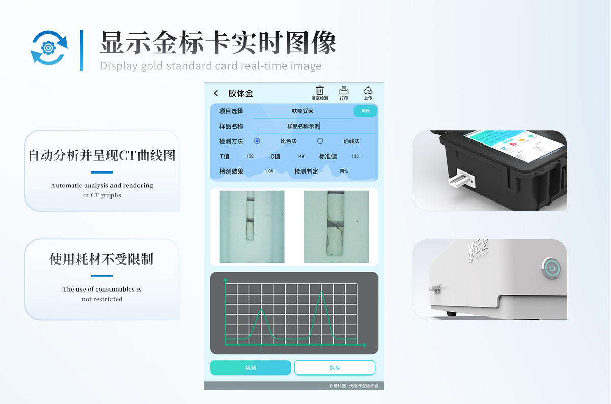 | 儀器采用10.1英寸液晶觸摸屏顯,搭配運行安卓智能操作系統,主控芯片采用ARM Cortex-A7,RK3288/4核處理器,主頻1.88Ghz,運轉速度更快速,性能更強。 | 儀器功能包括:膠體金檢測模塊、數字化管理模塊、無線通訊模塊等,可以滿足同一軟件下實現所有檢測項目的檢測,并在同一窗口展示檢測結果。 | 一體化臺式快檢設備,采用交直流兩用供電方式,可連接車載電源,配備6ah大容量充電鋰電池,可以滿足現場及流動檢測使用的需求。儀器尺寸:43×35×20cm, 主機凈重:5.1kg | 系統自帶數據集成模塊,設備首頁自動統計檢測數據包含:周檢測數據、月檢測數據,全部檢測總數量,均包含檢測總數,合格數,不合格數,以及相關柱形分析圖,對各項檢測數據清晰掌握,無需電腦查詢,更加快捷直觀。 | 儀器具有任務預設模塊,可在樣品送檢前提前預設樣品名稱、檢測指標、送檢單位等信息,樣品送檢時一鍵調取保存信息,檢測更加方便快捷。 | 直插式自動掃描方式,可實時顯示金標卡實時圖像,系統自動分析并呈現出CT曲線圖,CT線自動識別,無需手動調整,完成檢測后自動退出檢測卡。 | 結果判定線可修改,對照值標定值可保存,斷電不丟失數據。 | 兼容市場上其他膠體金卡,使用耗材不受限制,極大增強用戶使用體驗。 | 儀器檢測系統擁有龐大數據庫,并且構建了完善的檢索、修訂功能。食品庫涵蓋多種樣品名稱,可按需添加或刪除、編輯樣品名稱;產品數據庫以及歷史檢測記錄支持一鍵檢索功能。 | 系統打印自定義化,打印格式多樣化,產品合格證(****要求),二維碼,抽樣信息、檢測信息,受檢信息、復核信息、抽樣日期、檢測日期等信息結果,可按需求自行設置打印內容。 | A4紙版本報告打印功能(可選配):設備擁有兩種結果展示方式,可以自動生成A4打印模板和小票打印模板兩種樣式,可通過WiFi及網線等方式鏈接外置打印機可進行打印 | 儀器具有 wifi 聯網上傳、RJ45網線連接功能,可以快速上傳數據。同步對接監管平臺,數據可局域網和互聯網數據上傳,檢測結果直接傳至食品安全監管平臺。進行區域食品安全監管及大數據分析處理與數據統計,檢測區域食品安全長短期動態,達到食品安全問題預估、預警。 | 設備支持U盤存儲,標準USB接口,免驅動安裝。檢測結果存儲容量20萬條以上,可生成Excel表格,進行一鍵拷貝,并具有登錄保護功能,可設置用戶名及密碼,規范不同人員操作權限,防止非工作人員操作,并且可以進行重新校準、鎖定、恢復出廠設置功能。儀器固件可升級,后期檢測項目可擴充。 | 儀器具有重新校準、鎖定、恢復出廠設置功能。 | 儀器具備遠程升級功能,可定向分客戶分儀器更新,開機后自動更新,并可持續性免費更新系統版本,無需像傳統產品返廠更新,節省時間及人力成本并避免了物流運輸返廠升級導致設備損壞的潛在風險。 |
