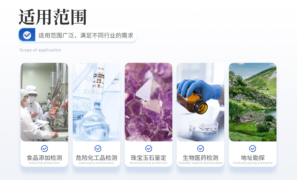 | 食品違禁添加物、色素添加、農獸藥殘留檢測 | 爆炸物、危險化工品、易燃易爆品檢測 | 珠寶玉石鑒定、文物鑒別 | 生物醫藥檢測、材料表征、地址勘探等 | 其他各類訂制應用 |
