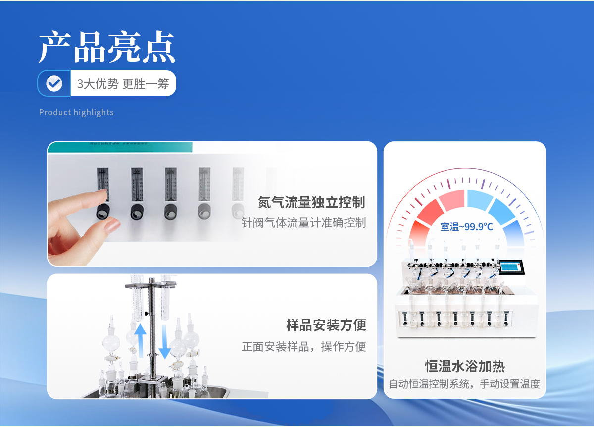 | 1、大容量反應瓶,可同時處理多個樣品。 | 2、鹽酸口、氣體進口、出口三口一體且相互獨立,操作會不干擾。 | 3、恒溫水浴加熱,具有快速自動恒溫控制系統,加熱溫度可以手動設定。 | 4、由升降位置固定旋鈕調節樣品架及配氣系統的升降旋轉樣品架,正面安裝樣品,操作方便。 | 5、每個樣品的氮氣流量獨立控制調節或關閉,針閥氣體流量計準確控制和顯示氣體總消耗量。 |
