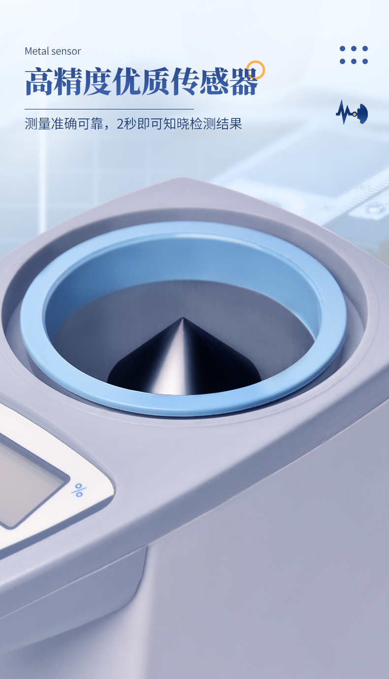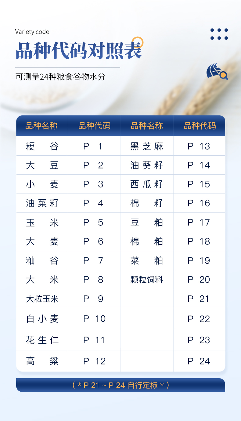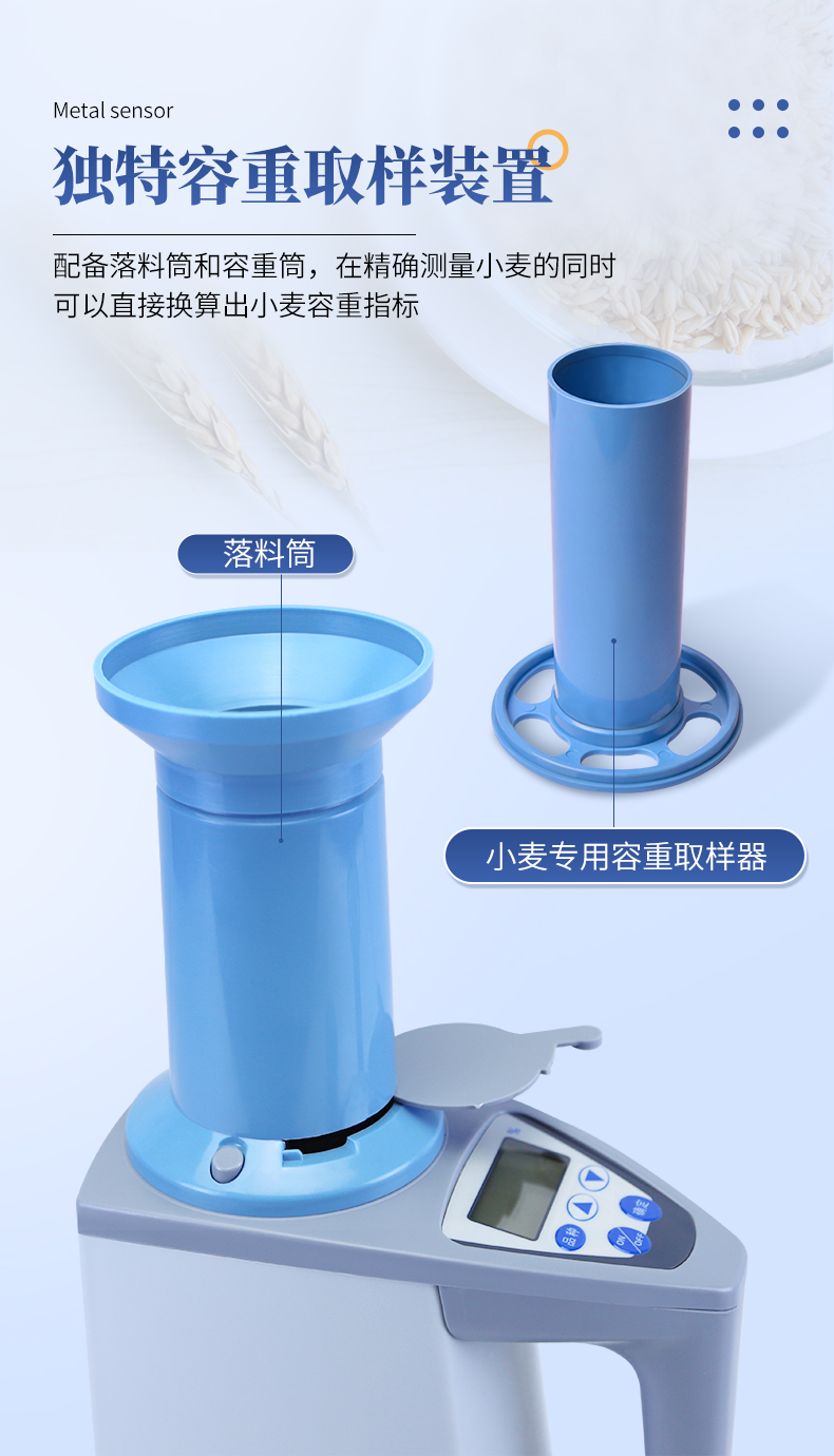 | 容重換算:獨特的專利容重取樣裝置在**測量小麥的同時,可以直接換算出小麥容重指標。 | 測量范圍:可測量谷類、玉米、東北玉米、大麥、小麥、白小麥、大米、豆粕、花生仁、菜粕、高粱、黑芝麻、棉籽、棉粕、秈谷、大豆、油菜籽、飼料、蔬菜種子等非金屬顆粒狀物質。 | 快速準確:數秒內即可顯示結果,測量誤差≤±0.5℅ | 操作簡單:20個常見品種已預先定標,不需秤樣、用料簡取樣后可立即測量水分 | 水分測量范圍:3-35℅ | 使用環境溫度:0~40℃ | 溫度補償:自動 | 定 標:浮動四點定標,品種不限(常見品種20個已預先定標,可直接測量) | 工作電源,直流6V(5號干電池四節) | 自動關機:超過三分鐘無操作自動關機。 | 便攜方便:重約1千克、外型小巧、電源交直流二用,適合各種工作場合 | 適合國情:用戶可對本地特殊品種采用本機獨創的四點定標法自行定標,自行修正水分值 | 高性價比:技術含量高,性能**而價格相比同類產品較低。 |