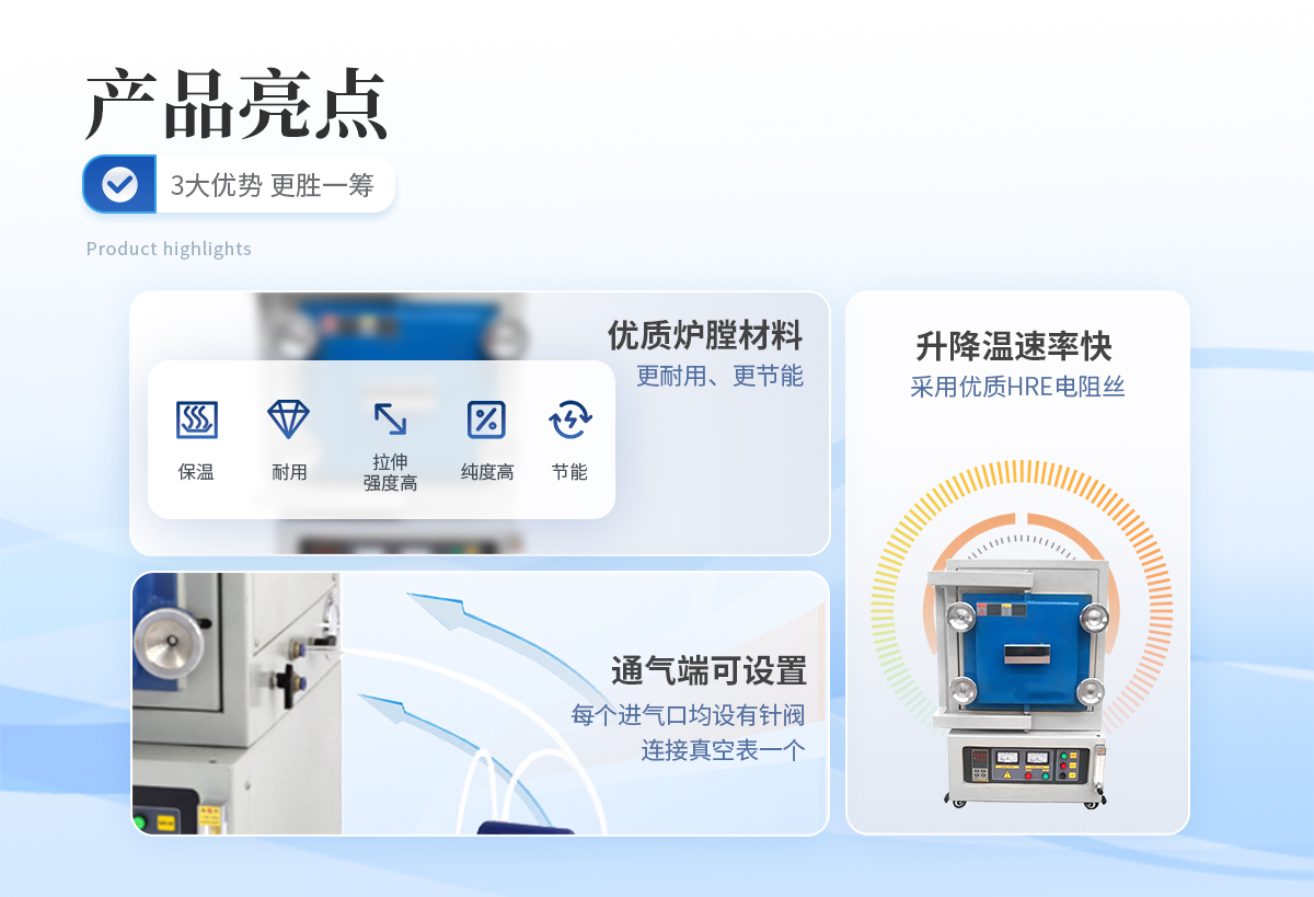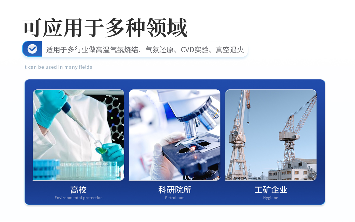 用于高校、科研院所、工礦企業(yè)做高溫氣氛燒結、氣氛還原、CVD實驗、真空退火等。具有溫場均勻、升降溫速率快、節(jié)能、可通入多重氣體等特點。