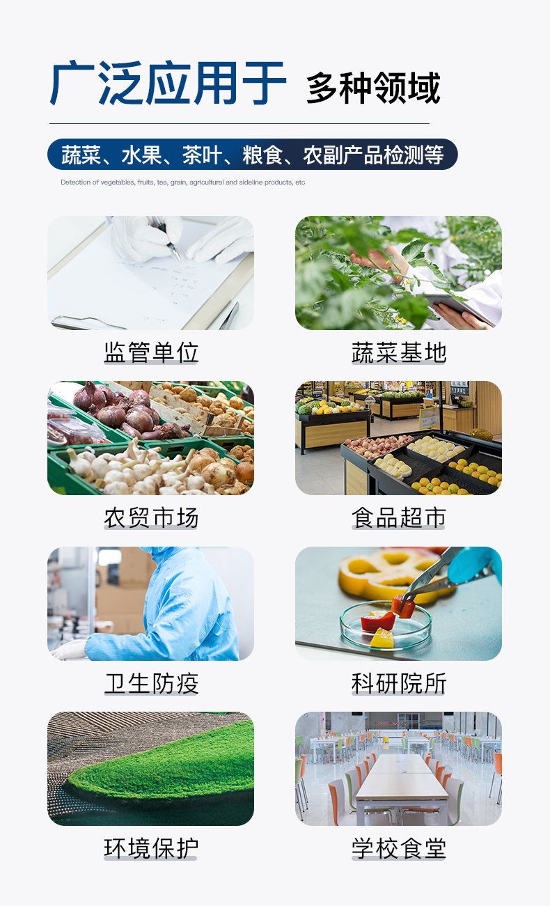 該儀器依據(jù)****(GB/T 5009.199-2003)和農(nóng)業(yè)標(biāo)準(zhǔn)方法(NY/T 448-2001)中的酶抑制率法設(shè)計(jì)制造,能準(zhǔn)確、快速檢測(cè)出蔬菜、水果、農(nóng)產(chǎn)品、茶葉等固體或液體中有機(jī)磷和氨基甲酸酯類(lèi)農(nóng)藥殘留量。廣泛適用于各級(jí)食品安全監(jiān)測(cè)部門(mén)、蔬菜生產(chǎn)基地、蔬菜批發(fā)基地、農(nóng)貿(mào)市場(chǎng)、食品超市、食品安全檢測(cè)流動(dòng)車(chē)、衛(wèi)生防疫、環(huán)境保護(hù)等領(lǐng)域。