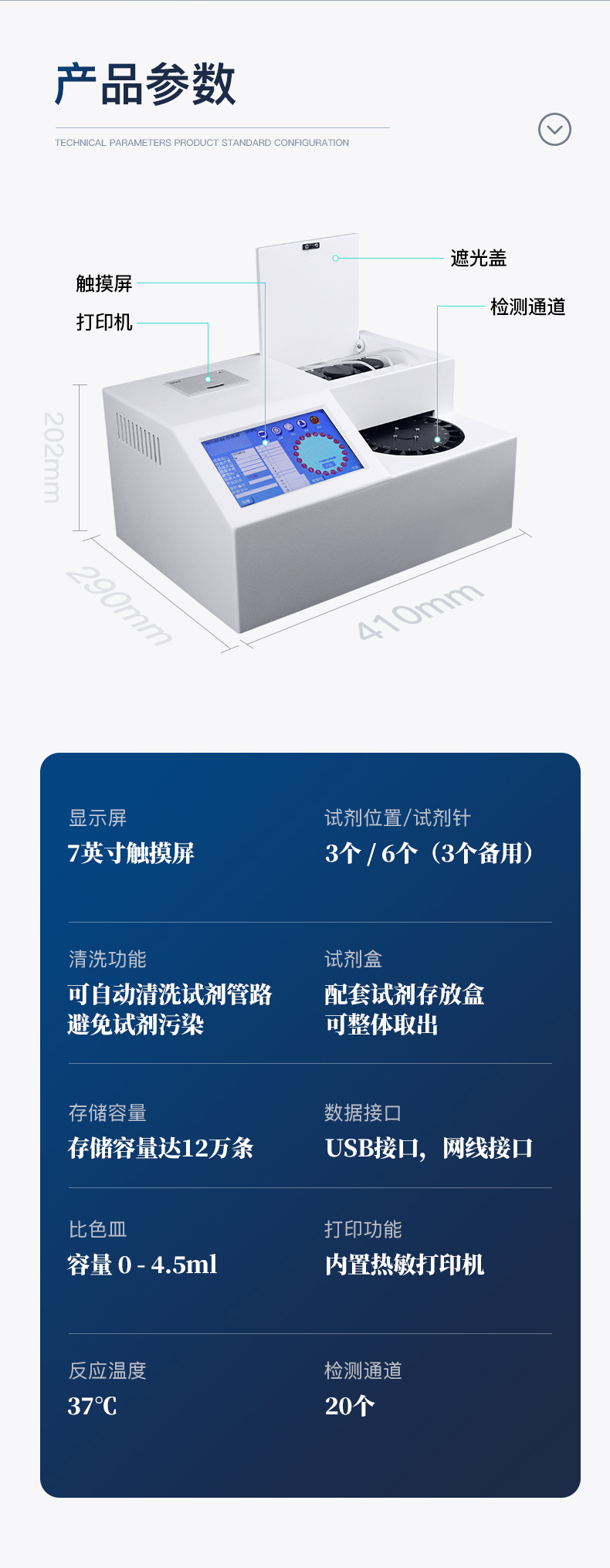 | 1. 波長(zhǎng)配置:410 | 2. 試劑位置:3個(gè) | 3. 試 劑 針:6個(gè)(3個(gè)備用) | 4.:檢測(cè)通道:20個(gè) | 5.反應(yīng)溫度:37℃ | 6.觸 摸 屏:7寸觸摸屏 | 7比 色 皿:容量 0 - 4.5ml | 8.試 劑 盒:配套試劑存放盒,可整體取出 | 9.清洗功能:可自動(dòng)清洗試劑管路,避免試劑污染 | 10.實(shí)時(shí)監(jiān)控:儀器測(cè)試過(guò)程中顯示運(yùn)行狀態(tài) | 11.打印功能:內(nèi)置熱敏打印機(jī) | 12.數(shù)據(jù)存儲(chǔ):大容量存儲(chǔ)器,能存儲(chǔ)12萬(wàn)條數(shù)據(jù) | 13.數(shù)據(jù)接口:外接USB接口,網(wǎng)線(xiàn)接口 | 14.儀器重量:約6KG | 15.儀器尺寸:410mm*290mm*202mm |