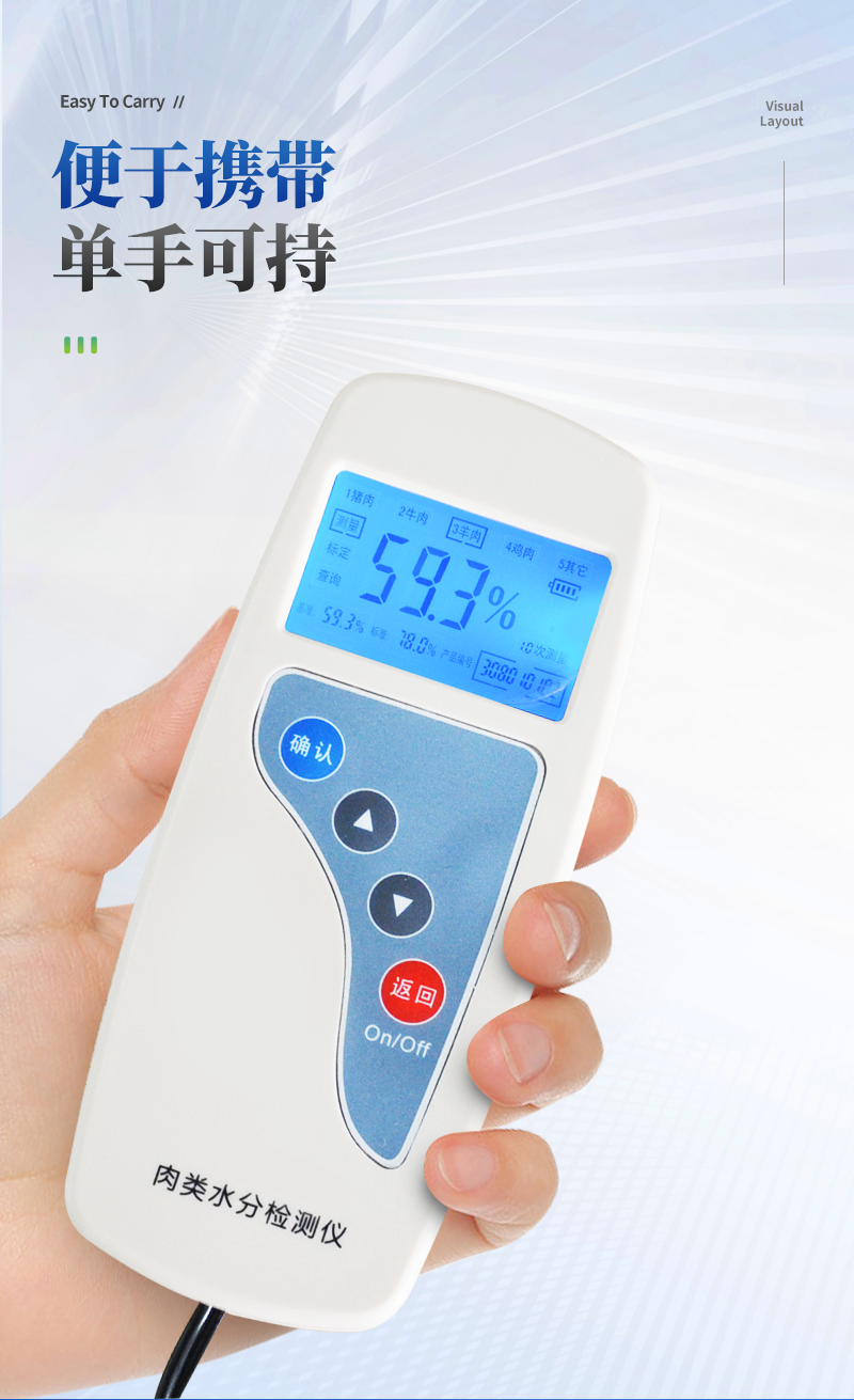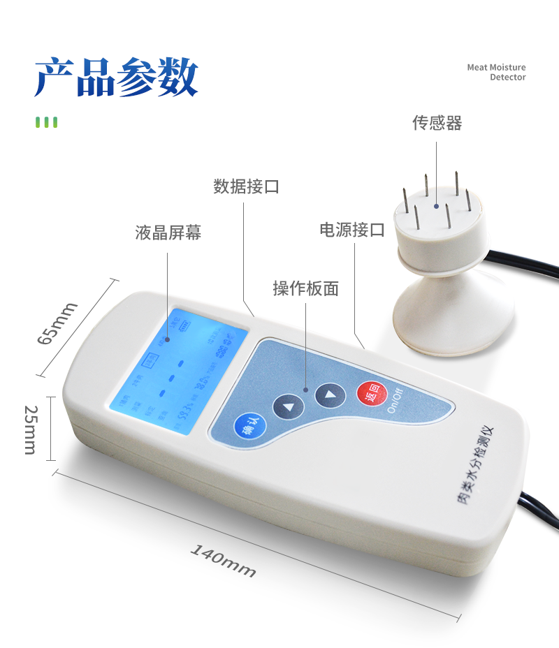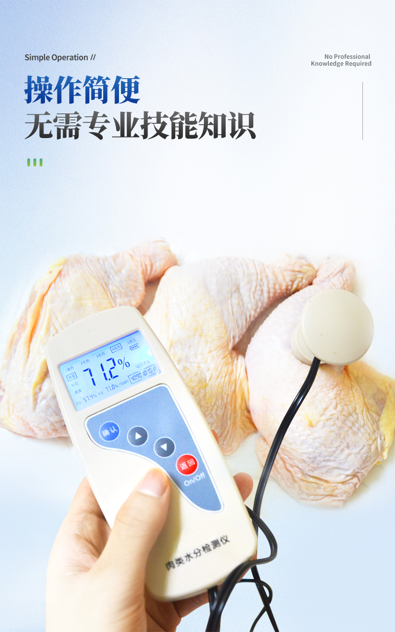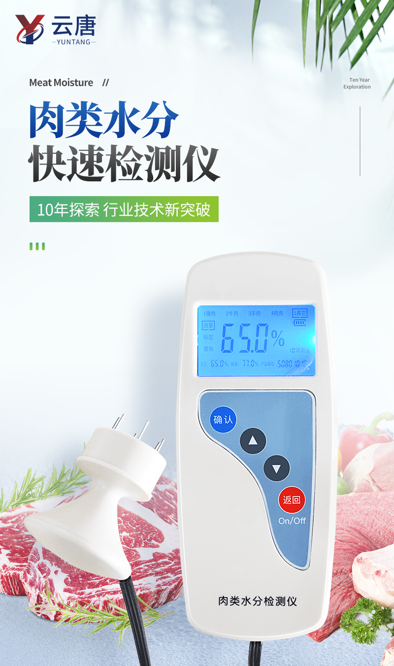 產品簡介: 肉類水分檢測儀主要用于快速豬肉、牛肉、雞肉等動物肉類水分含量,從而判斷所測樣品是否為注水肉,該儀器設計精巧,單手可持,儀器可根據測定對象的品種,設定相應的判斷標準值。 產···
