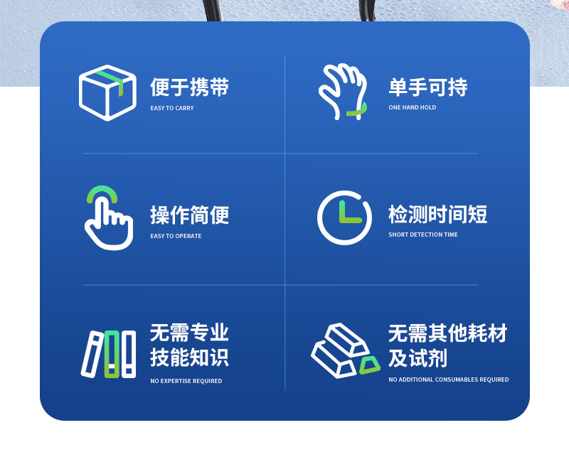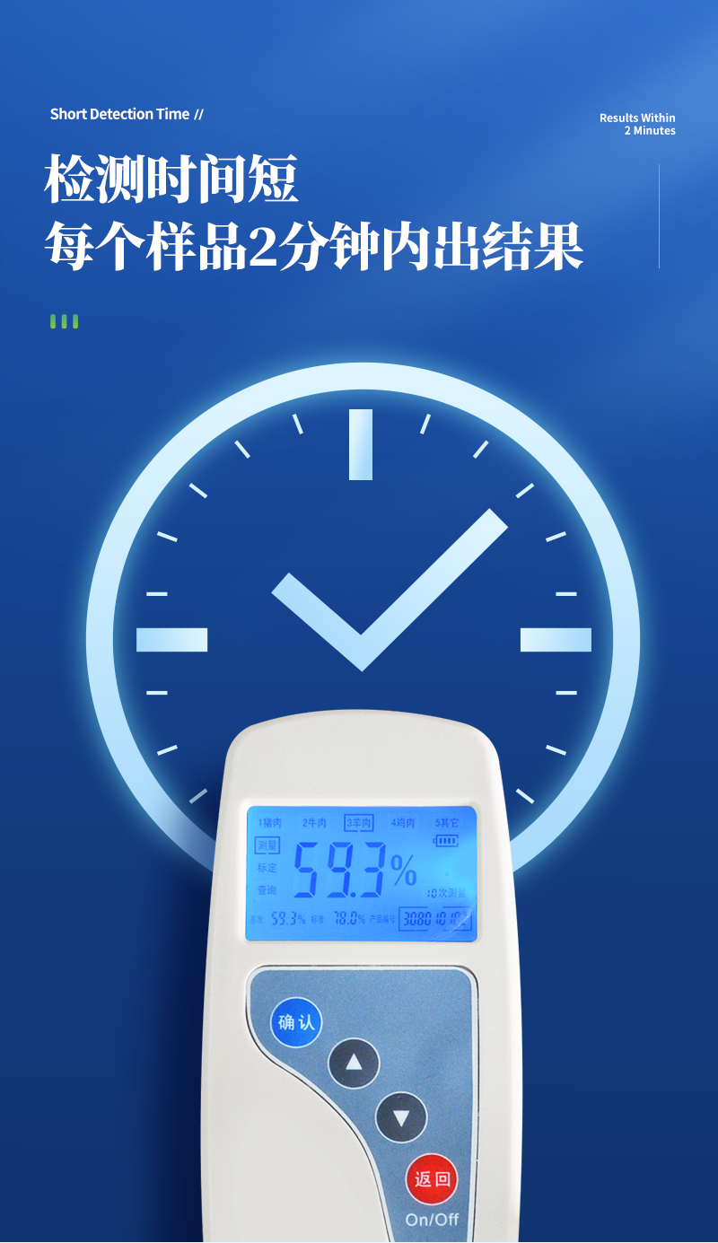| 便于攜帶,單手可持 | 可根據測定對象的品種,設定相應的判斷標準值 | 操作簡便,檢測人員無需專業技能知識 | 檢測時間短,每個樣品2分鐘內出結果; | 檢測試驗無需其他耗材及試劑 |