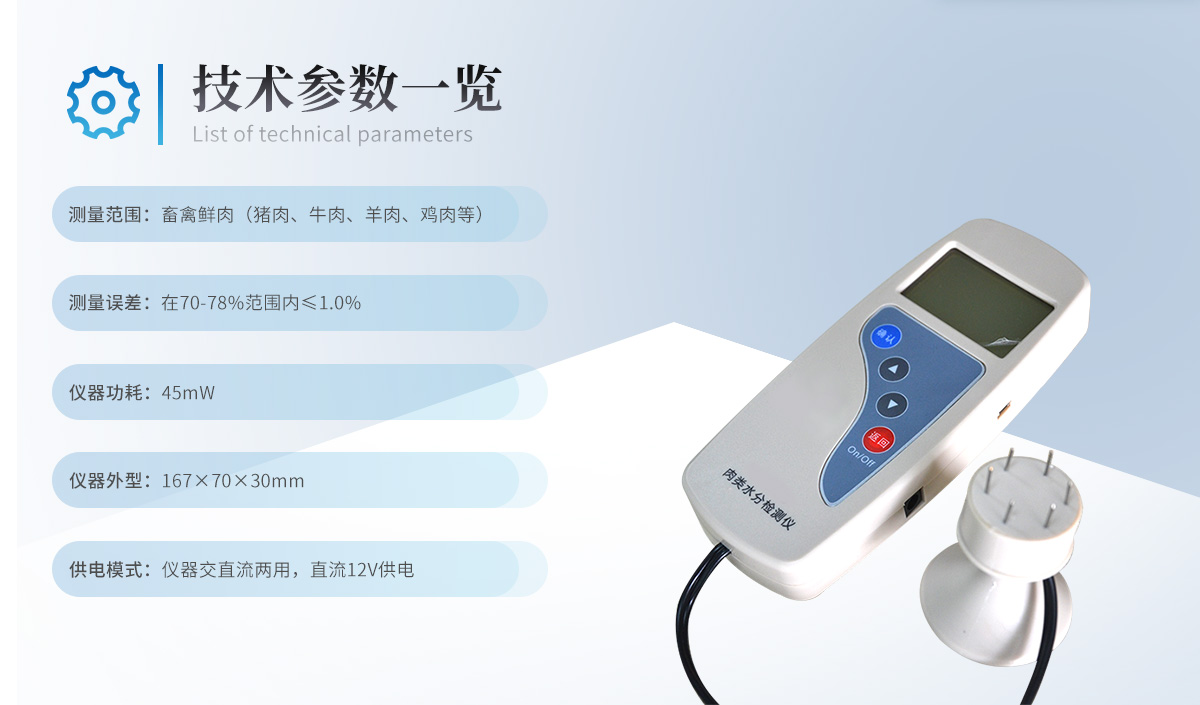 產品簡介: 肉類水分檢測儀主要用于快速豬肉、牛肉、雞肉等動物肉類水分含量,從而判斷所測樣品是否為注水肉,該儀器設計精巧,單手可持,儀器可根據測定對象的品種,設定相應的判斷標準值。 產···