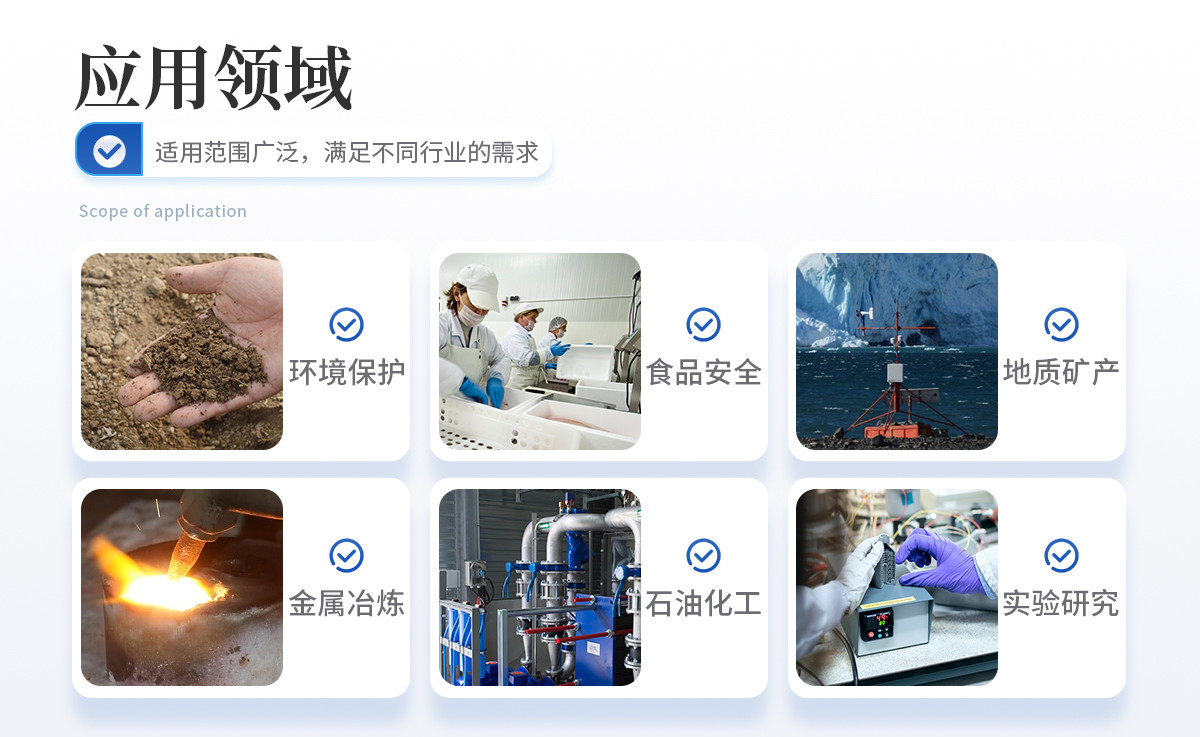 原子熒光光譜儀的應(yīng)用領(lǐng)域較為廣泛,主要測試樣品中 11 種超痕量元素的含量,**檢測下限可達(dá)千億分之一級。應(yīng)用領(lǐng)域包括水質(zhì)、土壤、大氣等樣環(huán)境檢測項目、食品檢驗、檢驗檢疫、藥品檢驗、化妝品檢驗、土壤飼料肥料檢驗、地質(zhì)礦產(chǎn)測試、冶金樣品檢驗、教學(xué)研究等。