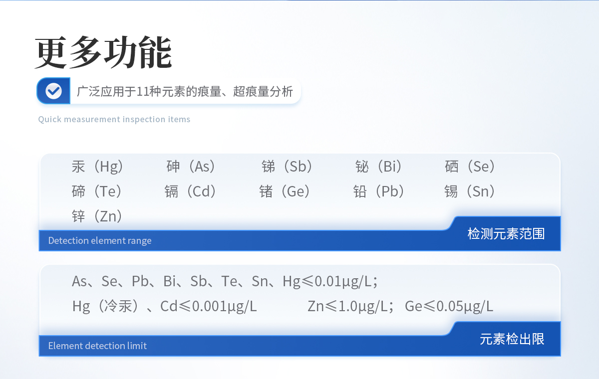2、元素檢出限 As、Se、Pb、Bi、Sb、Te、Sn、Hg≤0.01μg/L; Hg(冷汞)、Cd≤0.001μg/L; Zn≤1.0μg/L; Ge≤0.05μg/L。 |