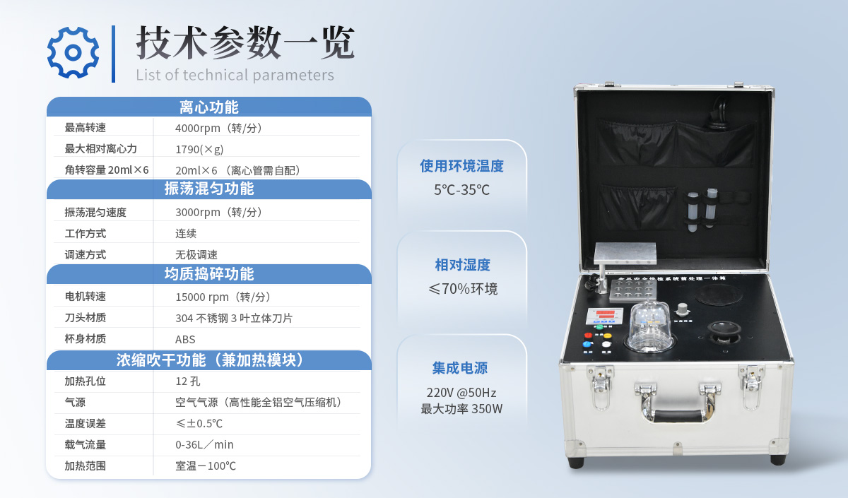 樣品前處理一體機1臺、帶氣孔支架1個、均質杯1個、說明書1份、產品合格證1份、電源線1條 離心機透明蓋一個