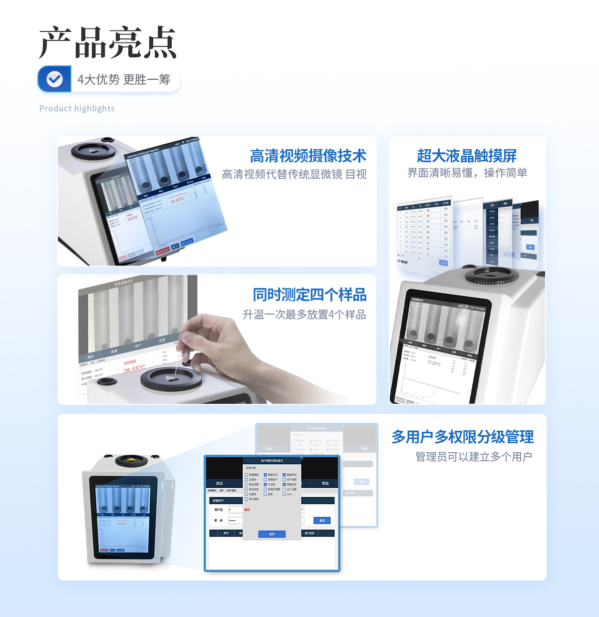 產品介紹: 全自動熔點儀完美結合高精度控溫技術和高清視頻攝像技術,不但為用戶提供準確、穩定、可靠的測試結果,還為用戶帶來**便捷的測試感受。高清視頻可方便清晰的看到樣品熔化的全過程,···