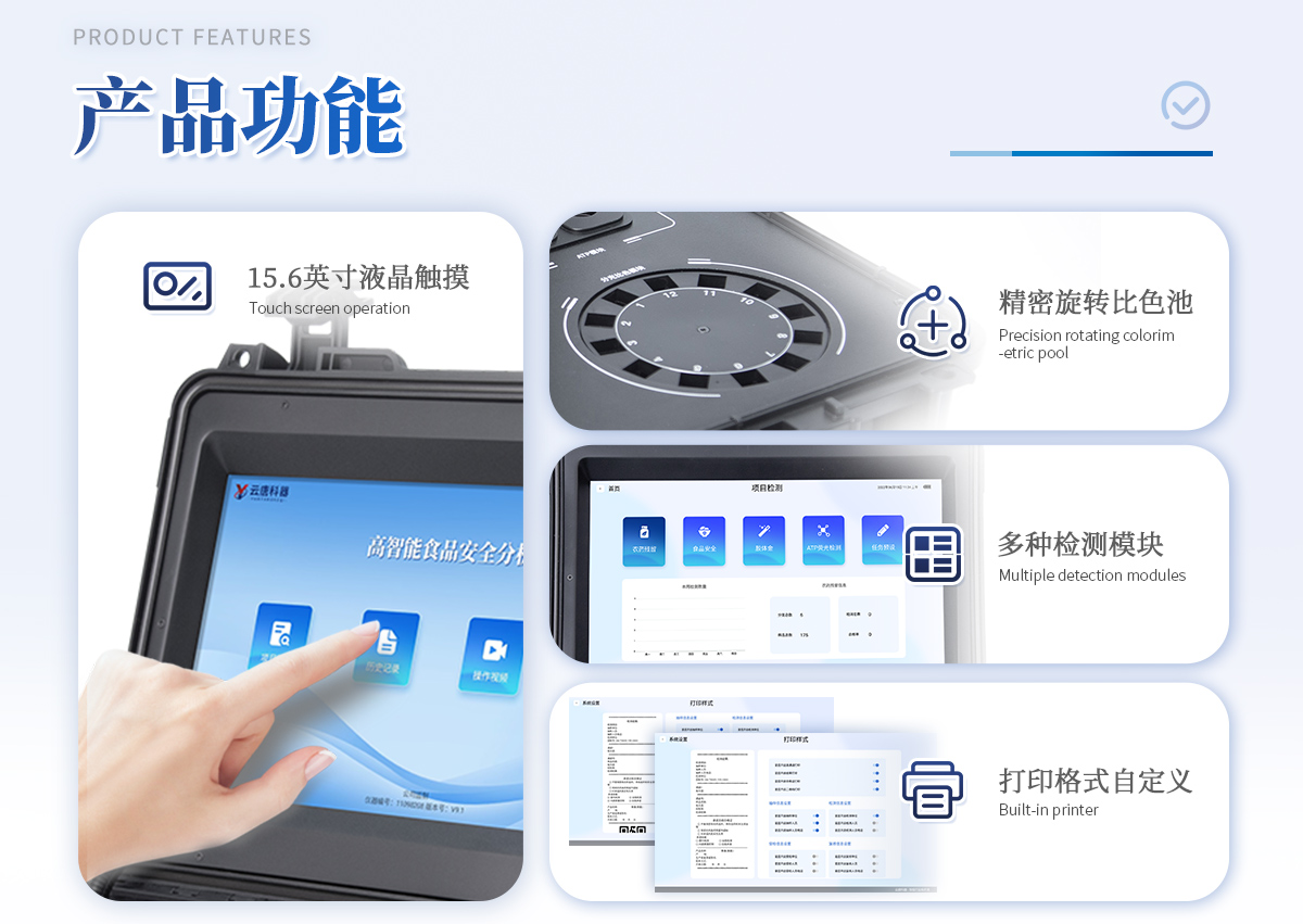 產品介紹: 山東云唐智能科技有限公司生產的食品安全綜合分析儀,采用多功能集成、箱儀一體化設計,以高強度安全防護箱為載體,內部集成多個檢測功能,適用于食藥監局、衛生部門、高教院校、科研···