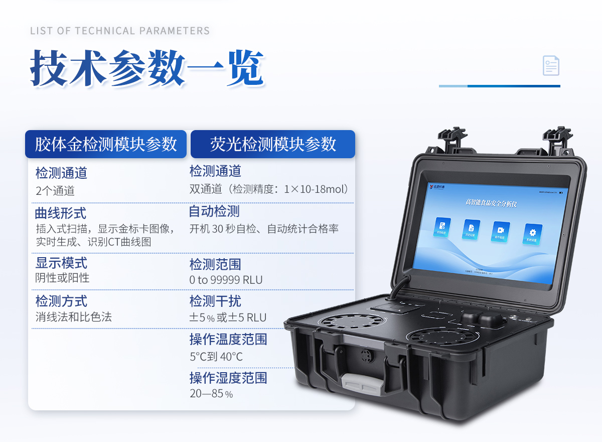 | 1. 功能構成:主要包括分光光度模塊、新型農殘檢測模塊、膠體金檢測模塊、熒光檢測模塊、數字化管理模塊等,所有模塊集成一體,可快速檢測200多種食品安全項目,如獸藥殘留、農藥殘留、非法添加劑、細菌數值等指標。 | 2. 檢測樣品種類:餐具及廚房用品、瓜果蔬菜及其制品、水產品及其制品、畜禽產品及其制品、嬰幼兒乳品及奶粉制品、蜂蜜、糧油及其制品、調味品(食醋、醬油、味精、鹽等)、酒類茶葉及其制品、食用菌、飲料、蛋類藥物殘留(雞蛋,鴨蛋等)、米豆面制品、糖果糕點類(小食品)、薯類及膨化食品、瓶(桶)裝飲用水、添加食用色素的食品、使用添加劑的食品、含有有毒有害物質的相關食品。 | 3、顯示屏幕:儀器采用15.6英寸液晶觸摸屏顯,搭配運行安卓智能操作系統,主控芯片采用ARM Cortex-A7,RK3288/4核處理器,主頻1.88Ghz,操作方便,性能更強。 | 4、供電模式:儀器交直流兩用,直流12V供電,可連接車載電源,配18ah大容量充電鋰電池,電量可實時顯示,無外部電源條件下可持續工作至少 4 小時。 | 5、檢測通道:≥24通道;采用精密旋轉比色池設計,使用同芯片同光源校準精度,解決不同光源之間的誤差值,更加準確**,采用高精度進口四波長冷光源,每個通道均配置 410、520、590、630nm 波長光源,標配**的光路切換裝置,專利光路切換功能可實現64波長,并且所有檢測項目可實現所有通道同時檢測. | 6、通訊接口:配備無線通信模塊、4G(APN)通訊模塊、藍牙傳輸,同時具有雙USB接口以及RJ45網線接口,可以多方式實現數據保存及數據傳輸。 | 7、存儲方式:支持U盤存儲,兩個標準USB接口,免驅動安裝。檢測結果存儲容量20萬條以上,可生成Excel表格進行拷貝,并具有登錄保護功能。 | 8、操作系統:儀器可在同一檢測界面自動對應相關檢測通道,一次性選擇不少于11個樣品名稱,無需退出界面,節省操作時間。并可以對每個通道屬性和樣品信息單獨進行編輯,例如送檢單位、人員,檢測人員等,打印時勾選打印顯示。 | 9、數據集成系統:設備首頁自動匯總分析檢測數據,包含:周檢測數據、月檢測數據,全部檢測總數量,包含檢測總數,合格數,不合格數,以及相關柱形分析圖,各項檢測數據一目了然,無需電腦查詢,更加快捷直觀。 | 10、數據庫系統:十幾項數據庫分類管理儀器:包含項目類型、項目數據、檢測數據、歷史記錄、國標信息、曲線信息、采樣信息、檢測信息、受檢信息、復核信息、圖表信息、光源校準信息、打印樣式信息、樣品庫信息等等,數據庫之間互相協調聯動保證數據的真實完整性。同時產品數據庫以及歷史檢測記錄支持一鍵檢索功能。 | 11、限量規判系統:具有限量查詢、添加物質合規判定系統。檢測出結果后,系統自動調用系統數據庫中相關國標進行比對判定,客觀顯示判定結果是否合格。 | 12、項目預設系統:儀器具有任務預設模塊,一鍵提前預設,給出方便快捷的新檢測方案,每一個任務分別可以設置不同的樣品、批次、編號、來源、備注、抽樣信息、檢測信息、受檢信息、復核信息等更多信息。樣品送檢時一鍵調取保存信息,并可多次調取,適用于大批量檢測業務,可以大大提高檢測效率。 | 13、數據監管系統:同步對接監管平臺,數據可局域網和互聯網數據上傳,檢測結果可直接傳至食品安全監管平臺。進行區域食品安全監管及大數據分析處理與數據統計,監測區域食品安全長短期動態及問題預估、預警。 | 14.1、全新打印系統:內置全新打印機,新創自定義打印方式,可按需靈活勾選控制:產品合格證(國家農業部標準要求),二維碼,抽樣信息、檢測信息,受檢信息、復核信息、抽樣日期、檢測日期等信息的打印。 | 14.2、A4紙版本報告打印功能:設備擁有兩種結果展示方式,可以自動生成A4打印模板和小票打印模板兩種樣式,可通過WiFi及網線等方式連接外置打印機可進行打印。 | 15、膠體金檢測模塊:采用單通道CMOS成像處理技術及膠體金免疫層析技術,可讀取膠體金卡數據,自動采集、處理分析,將檢測結果顯示,并可根據參考限值自動判斷檢測結果,可檢測常見的獸藥殘留、生物毒素、抗生素、違禁添加物等。 | 15.1、可即時檢測單聯卡及三聯卡; | 15.2、檢測通道:2個通道; | 15.3、檢測方式:消線法和比色法; | 15.4、顯示模式:陰性或陽性; | 15.5、曲線形式:插入式掃描方式,顯示金標卡圖像,實時生成、識別CT曲線圖,無需手動調整。兼容市場上其他金標卡,使用耗材不受限制。 | 16、熒光檢測模塊:快速檢測水質中微生物、固體物細菌含量。利用“熒光素酶—熒光素體系”快速檢測三磷酸腺苷(ATP)。以ATP含量表明樣品中微生物與其他生物殘余得多少,用于判斷衛生狀況。 適用于食品、餐具、手、液體等表面及水質潔凈度的檢測。 | 16.1、檢測通道:雙通道 檢測精度:********** | 16.2、檢測范圍:0 to 99999 RLU | 16.3、檢測時間:15 秒 | 16.4、檢測干擾:±5﹪或±5 RLU | 16.5、操作溫度范圍:5℃到 40℃ | 16.6、操作濕度范圍:20—85﹪ | 16.7、開機 30 秒自檢、內置自校光源、自動判斷合格與不合格、自動統計合格率 。 | 17、儀器具備遠程升級功能,可定向分客戶分儀器更新,開機后自動更新,并可持續性免費更新系統版本,無需像傳統產品返廠更新,節省時間及人力成本并避免了物流運輸返廠升級導致設備損壞的潛在風險。 |