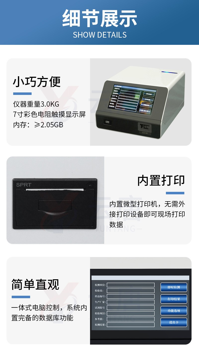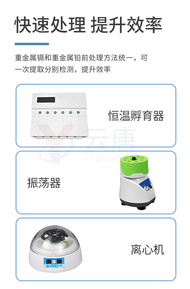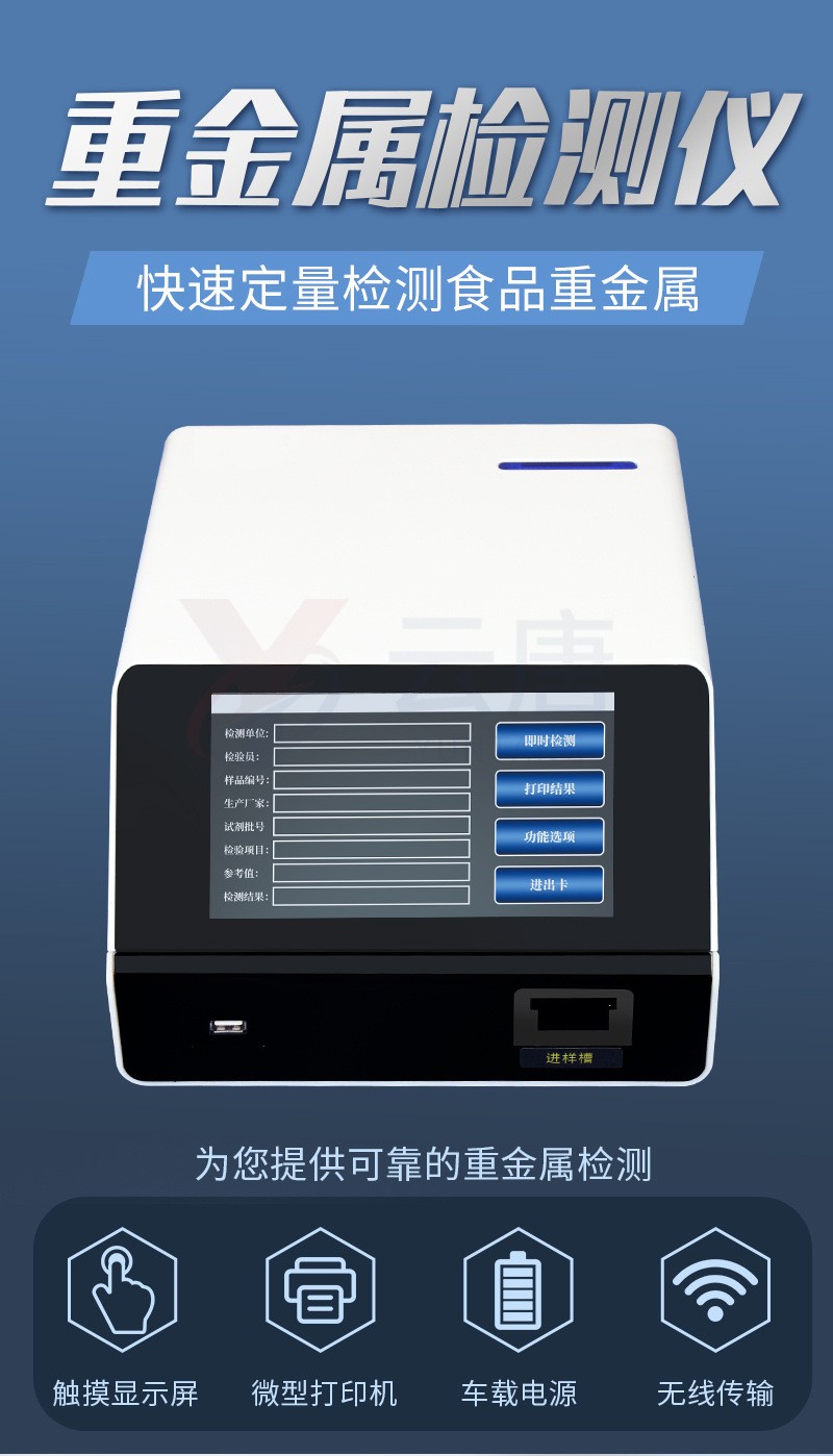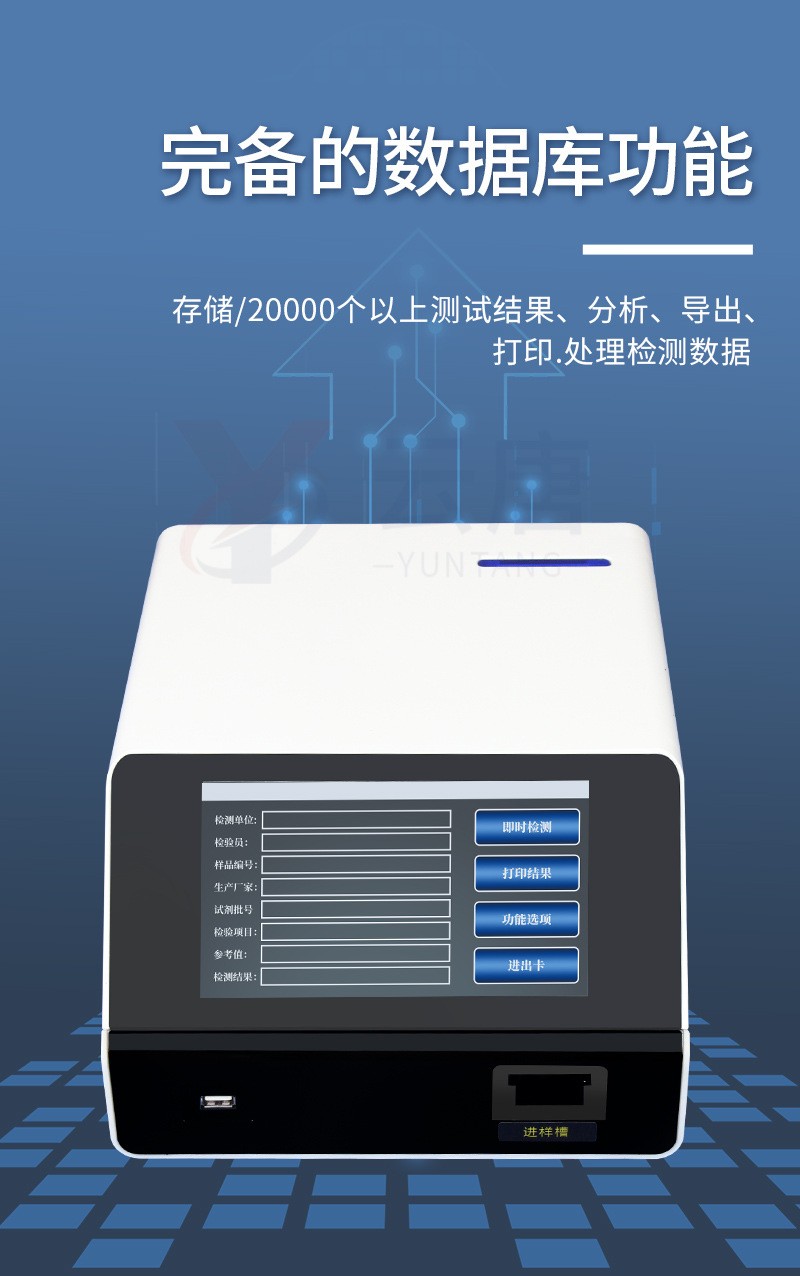 | 1.儀器能同時檢測大米、糧食、糧食制品、飼料、飼料原料中重金屬鎘、鉻、鉛、銅等指標。 | 2.具有免疫層析膠體金檢測快速檢測分析方法,可擴展檢測真菌毒素、農藥殘留,系統采用手提或拉桿設計,滿足現場及流動檢測的需求。 | 3.內置操作系統,一體式電腦控制,無需外接電腦,能耗≦15W,檢測數據和位置信息可發送至網絡或數據平臺,能夠與各類監測信息系統實現無縫對接。配合信息管理平臺進行區域安全監管及大數據分析處理,方便食品安全問題預估、預警。 | 4.內置無線傳輸模塊,USB接口,RS232接口,以太網口,數據既可通過無線和有線連接傳輸,可添加內置GPS定位模塊,可實時定位。 | 5.檢測儀尺寸:儀器重量3.0kg,7寸彩色電阻觸摸顯示屏,內存:≥2.05GB,內置微型打印機,無需外接打印設備即可現場打印數據。 | 6.220V電源,車載電源,適合野外現場操作。 | 7.完備的數據庫功能(實時顯示,存儲/20000個以上測試結果、分析、導出、打印、處理檢測數據),膠體金檢測卡模塊儲存記錄有檢測時間、檢測單位、檢測人員、檢測項目、樣品編號、檢測結果、參考值等。 | 8.免疫層析膠體金檢測模塊 | (1)采用掃描成像技術及免疫層析膠體金技術,可實現重金屬(鎘、鉛)快速定量檢測分析; | (2)檢測卡卡槽:≤8×2×0.5cm,檢測方式:掃描,掃描精度CV≤1.0%,檢測時間≤5秒,測量重復性≤3%,光源:獨立穩定恒流光源,探測器:超敏光電傳感器。 | (3)標準曲線錄入方式:每批檢測卡試劑盒配有標準曲線ID卡,標準曲線錄入采用自動讀取,檢測過程無需準備標準品或質控品校準,操作簡單; | (4)檢測卡采用兩線法設計,定量檢測精密度(cv):檢測卡批內小于15%、批間小于20%,檢測卡采用塑料單卡獨立包裝,防止檢測條因暴露于環境而被污染且便于使用和保存,有效期:常溫保存6個月有效,2-8℃保存1年有效; | (5)前處理方法統一:重金屬鎘和重金屬鉛前處理方法統一,可一次提取分別檢測,提升效率; | (6)重金屬鎘、鉛檢測產品具有糧食系統國家級檢測機構產品評價報告。 | 9.恒溫孵育器 | (1)適用于定量膠體金試紙卡和反應液體**控溫反應,以提高準確性; | (2)孵育卡槽采用全封閉設計有利于**控溫,孵育器卡槽數6個,孵育孔數:6個,控溫溫度:37℃,控溫精度≤0.5℃,升溫速度≤10min,溫度均勻性≤0.3℃,實時溫度顯示精度:0.1℃。 | 10.振蕩器 | (1)振蕩方式:圓周多種模式混勻,可以觸發式點動運行、可長時間連續運行,振蕩速度范圍廣,0-2500rpm/min,低速平穩,高速強勁; | (2)能同時振蕩提取8個樣品,操作時無需操作人員來固定樣品進行振蕩,減小個人操作差異,提高檢測準確性。 | 11.迷你離心機:轉速:1000—12000rpm,可自行設定離心轉速和時間,體積:20×18×13cm,重量:1.5kg。 | 12.粉碎機:功率≥0.15 千瓦 破碎粒徑:小于 0.15mm 破碎樣品基本過 20 目篩網。 | 13.電子稱:量程:0~200g,分度值:0.01g,不銹鋼稱臺,LCD 顯示器,多種稱量單位選擇。 | 14.移液器:100~1000μL移液器 1支, 20-200μL移液器 1支,輕巧的移液操作按壓力,長時間操作不會造成肌肉損傷,移液結果。 | 15.檢測項目 | 1.項目:重金屬鎘;檢出限:0.02ppm;檢測范圍:0-1ppm | 2.項目:重金屬鉛;檢出限:0.02ppm;檢測范圍:0-1ppm | 3.項目:重金屬銅;檢出限:0.2ppm;檢測范圍:0-20ppm | 4.項目:重金屬汞;檢出限:0.01ppm;檢測范圍:0-0.3ppm | 5.項目:重金屬鉻;檢出限:0.05ppm;檢測范圍:0-5ppm | 6.項目:重金屬砷;檢出限:0.02ppm;檢測范圍:0-1ppm |