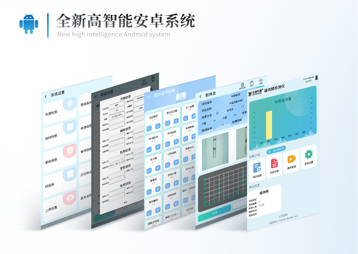 | 儀器采用10.1英寸液晶觸摸屏顯,搭配運行安卓智能操作系統,主控芯片采用ARM Cortex-A7,RK3288/4核處理器,主頻1.88Ghz,運轉速度更快速,性能更強。 | 儀器功能包括:膠體金檢測模塊、數字化管理模塊、無線通訊模塊等,可以滿足同一軟件下實現所有檢測項目的檢測,并在同一窗口展示檢測結果。 | 一體化臺式快檢設備,采用交直流兩用供電方式,可連接車載電源,配備6ah大容量充電鋰電池,可以滿足現場及流動檢測使用的需求。儀器尺寸:43×35×20cm, 主機凈重:5.1kg | 系統自帶數據集成模塊,設備首頁自動統計檢測數據包含:周檢測數據、月檢測數據,全部檢測總數量,均包含檢測總數,合格數,不合格數,以及相關柱形分析圖,對各項檢測數據清晰掌握,無需電腦查詢,更加快捷直觀。 | 儀器具有任務預設模塊,可在樣品送檢前提前預設樣品名稱、檢測指標、送檢單位等信息,樣品送檢時一鍵調取保存信息,檢測更加方便快捷。 | 直插式自動掃描方式,可實時顯示金標卡實時圖像,系統自動分析并呈現出CT曲線圖,CT線自動識別,無需手動調整,完成檢測后自動退出檢測卡。 | 膠體金模塊檢測方式:軌道式自動傳輸掃描,檢測完成后自動退出檢測卡。 | 儀器檢測系統擁有龐大數據庫,并且構建了完善的檢索、修訂功能。食品庫涵蓋多種樣品名稱,可按需添加或刪除、編輯樣品名稱;產品數據庫以及歷史檢測記錄支持一鍵檢索功能。 | 系統打印自定義化,打印格式多樣化,產品合格證(****要求),二維碼,抽樣信息、檢測信息,受檢信息、復核信息、抽樣日期、檢測日期等信息結果,可按需求自行設置打印內容。 | A4紙版本報告打印功能(可選配):設備擁有兩種結果展示方式,可以自動生成A4打印模板和小票打印模板兩種樣式,可通過WiFi及網線等方式鏈接外置打印機可進行打印 | 儀器具有 wifi 聯網上傳、RJ45網線連接功能,可以快速上傳數據。同步對接監管平臺,數據可局域網和互聯網數據上傳,檢測結果直接傳至食品安全監管平臺。進行區域食品安全監管及大數據分析處理與數據統計,檢測區域食品安全長短期動態,達到食品安全問題預估、預警。 | 設備支持U盤存儲,標準USB接口,免驅動安裝。檢測結果存儲容量20萬條以上,可生成Excel表格,進行一鍵拷貝,并具有登錄保護功能,可設置用戶名及密碼,規范不同人員操作權限,防止非工作人員操作,并且可以進行重新校準、鎖定、恢復出廠設置功能。儀器固件可升級,后期檢測項目可擴充。 | 儀器具備遠程升級功能,可定向分客戶分儀器更新,開機后自動更新,并可持續性免費更新系統版本,無需像傳統產品返廠更新,節省時間及人力成本并避免了物流運輸返廠升級導致設備損壞的潛在風險。 |